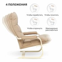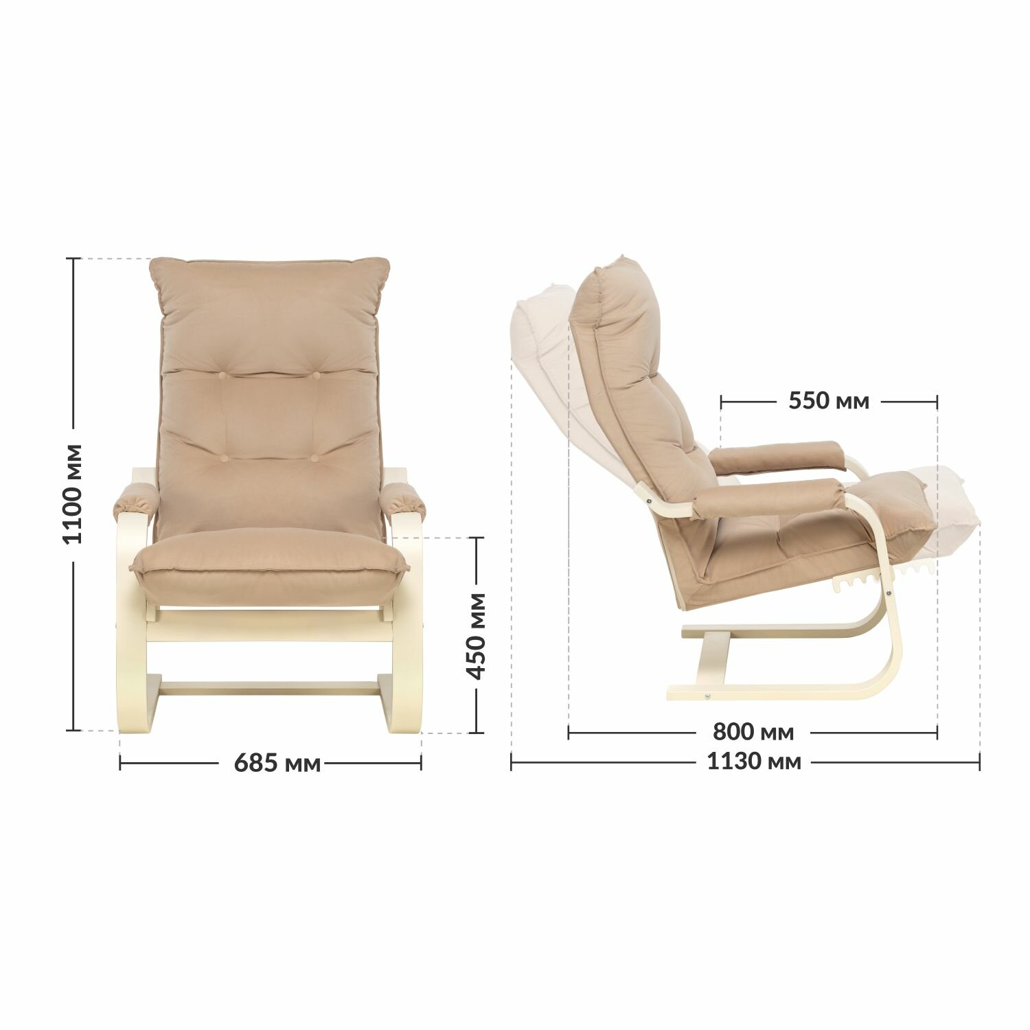 Популярное кресло Оливер украсит гостиную, спальню или прихожую в стиле модерн или хай-тек, а также станет фишкой зоны отдыха у вас на даче. Гнутоклееные кресла из линейки мягкой мебели Leset узнаваемы по плавным формам и высокой функциональности. Особенности модели: Кресло раскладное универсальное: может использоваться как в квартире, так и в благоустроенной беседке. Одним легким движением кресло трансформер приводится в 4 положения спинки. Силуэт раскладного кресла и гребенчатый механизм переключения напоминает шезлонг, за что кресло иногда называют раскладушкой. При этом качество наполнителя и обивки, премиальное исполнение основания и покрытие каркасной части дорогим итальянским лаком, а также комфортная глубина сиденья дарят чудесное расслабление и гарантируют здоровье позвоночника. Эргономичный каркас выглядит изящно, но выдержит до 120 кг нагрузки. Мягкая часть декорирована обтянутыми материалом пуговицами, дополнительный акцент вносит боковая окантовка, накладки на подлокотниках съемные на «липучках». Кресло компактно, подойдет для небольших уютных помещений. Трансформеры Оливер Leset с велюровыми подушками в коричневом и бежевом цветах доступны в сочетании с опорами в оттенках венге, слоновая кость, текстура ореха. Углы наклона спинки: 108°, 115°, 123°, 132°. Высота от пола до сиденья (верхняя точка): 450. Толщина сиденья: 100. Толщина каркаса боковин — 25, планок — 21. Съемные подлокотники на липучке. Наполнитель: поролон марки EL 2036, повышенной жёсткости. Ширина сиденья — 540. Глубина сиденья — 550. Высота спинки — 750