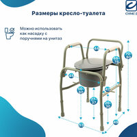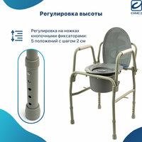 Кресло-туалет имеет откидные поручни и съемное ведро с крышкой. Высота сиденья регулируется по высоте, что позволяет подобрать наиболее удобное положение в кресле-туалете человеку разного роста. Ножки оснащены противоскользящими резиновыми наконечниками, обеспечивающими дополнительную безопасность.