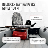 Кресло: - Ширина сиденья в лодку – 40 см, глубина - 40 см, высота спинки – 44 см - Материал обивки - оксфорд 600D PU 1000 - не промокает, не греется на солнце Поворотный механизм: - Металл 2мм, 48 шариков вкруг, отлично смазан Рама(стойка) для кресла в лодку пвх: - Стойка полностью универсальна - имеет 3 положения для выбора оптимальной высоты посадки занижение 60 мм, занижение 15 мм, без занижения - Под стойку помещается стандартный бак 24л. (Yamaha, Tohatsu, Suzuki и аналоги) - Сталь с порошковой окраской, толщина стали всех кронштейнов 2 мм, ножки 2 мм и 1.5 мм. - Ламинированная фанера первого сорта (ФОФ Россия). Толщина фанеры 18 мм - Торцы изделий покрыты влагостойкой пропиткой. Выточены пазы для установки поворотной платформы. - Высота от пола до верха столешницы регулируется для точной установки на Вашу лодку от 280 мм до 400 мм с шагом в 20 мм. - На ножке сделана накладка из искусственного тика, чтобы не переживать за потёртости Вашей лодки. Вылет ножки обеспечивает устойчивость сидения (Стойки универсальны для водителя и пассажира). Отличный подарок для любого рыбака!