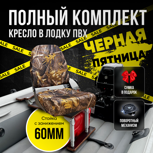 Полный, полностью собранный комплект для Вашей лодки с креслом: - Кресло в лодку комфорт с формованным ППУ - Металлическая поворотная платформа на подшипнике - Рама(стойка) с занижением 60 мм складная регулируемая (полностью универсальна, при необходимости занижение можно снять) - В подарок сумка на молнии для перевозки комплекта! Покупая комплектом Вам не нужно задумываться о совместимости товаров, всё уже собрано!