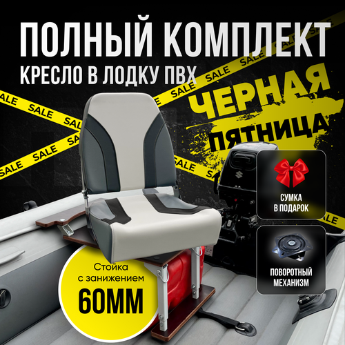 Полный, полностью собранный комплект для Вашей лодки с креслом: - Кресло в лодку комфорт с формованным ППУ - Металлическая поворотная платформа на подшипнике - Рама(стойка) с занижением 60 мм складная регулируемая (полностью универсальна, при необходимости занижение можно снять) - В подарок сумка на молнии для перевозки комплекта! Покупая комплектом Вам не нужно задумываться о совместимости товаров, всё уже собрано!