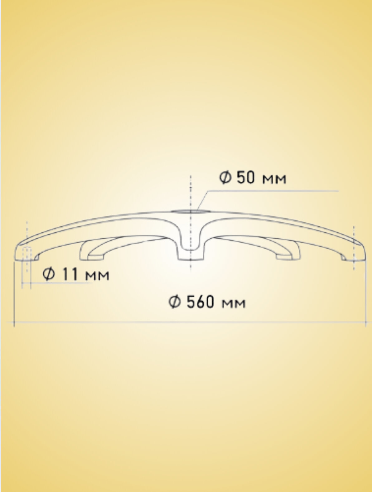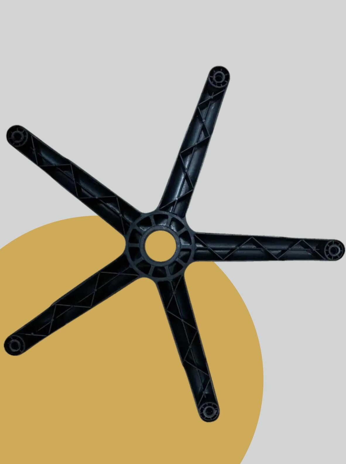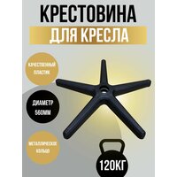 Крестовина (пятилучие) для компьютерных и офисных кресел, а также для стульев мастеров и т. д. На крестовине в месте установки газлифта присутствует металлическое кольцо, что делает конструкцию прочной и не дает газлифту раскачиваться. Внешний диаметр крестовины 56 см. Рабочая нагрузка до 120 кг. Совместима с 99 процентов кресел/стульев. Диаметр отверстия под газлифт 50 мм. Под крестовину подходят стандартные колеса, заглушки или глайдеры со штоком диаметром d11 мм.