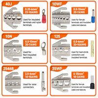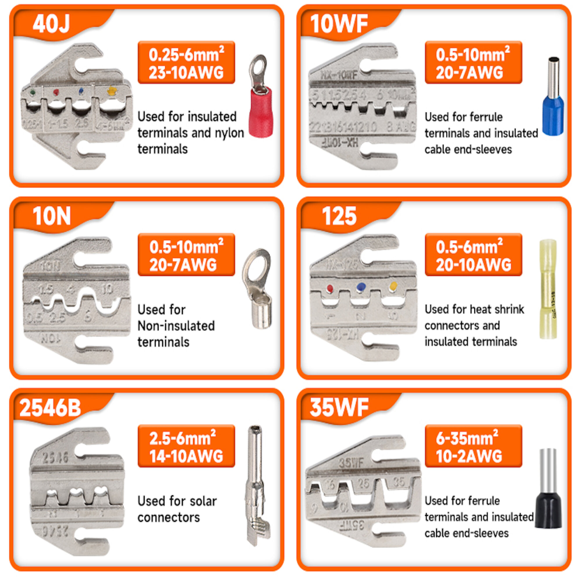 Кримпер и матрицы предназначены для профессионального использования и обладают высокой надежностью и долговечностью. Комплект включает в себя 6 дополнительных обжимных губок, Кримпер профессиональный для обжима клемм в наборе и штыревых наконечников. Клещи - пресс универсальный инструмент для обжима клемм и штыревых наконечников матрицы с широким диапазоном от 0,25 мм2.