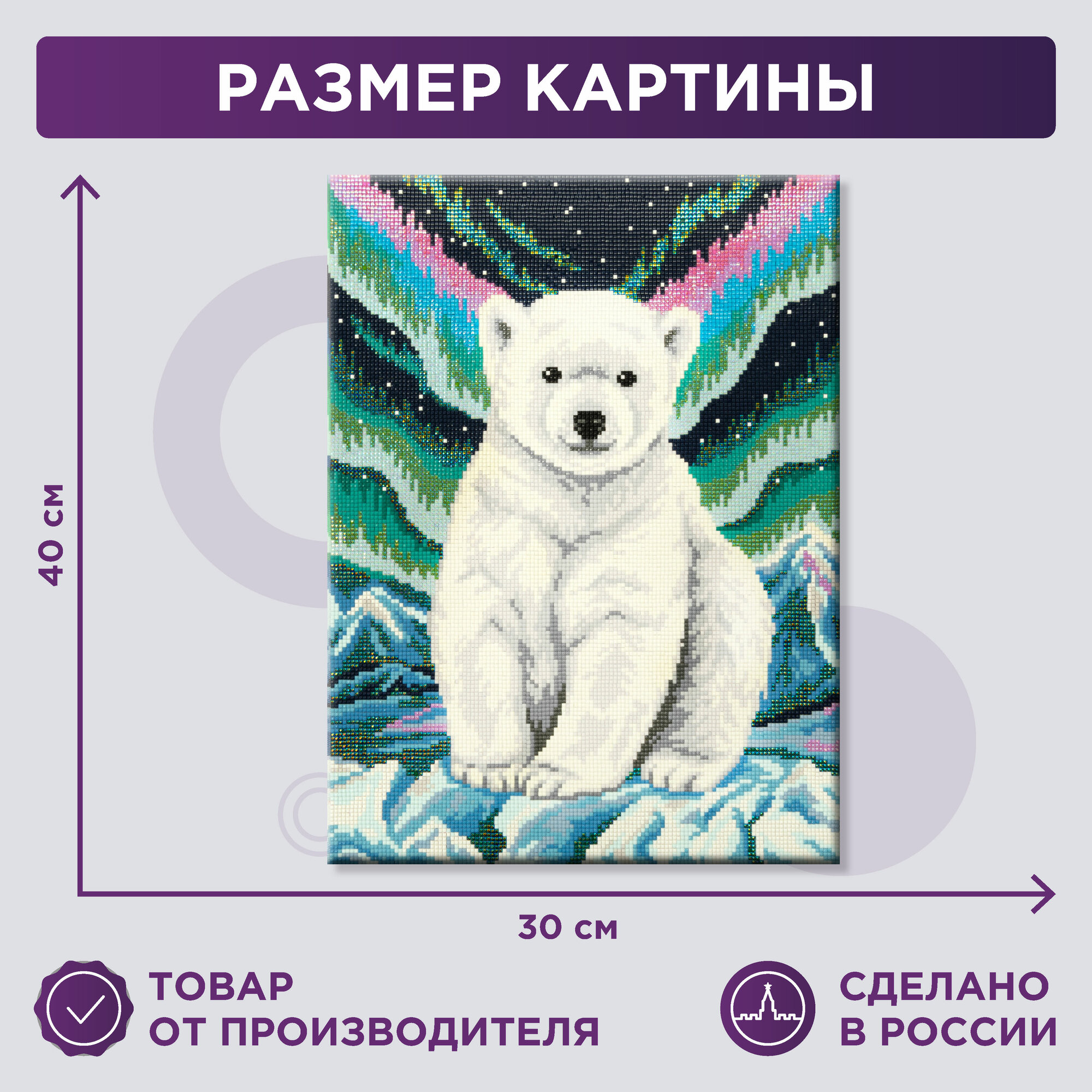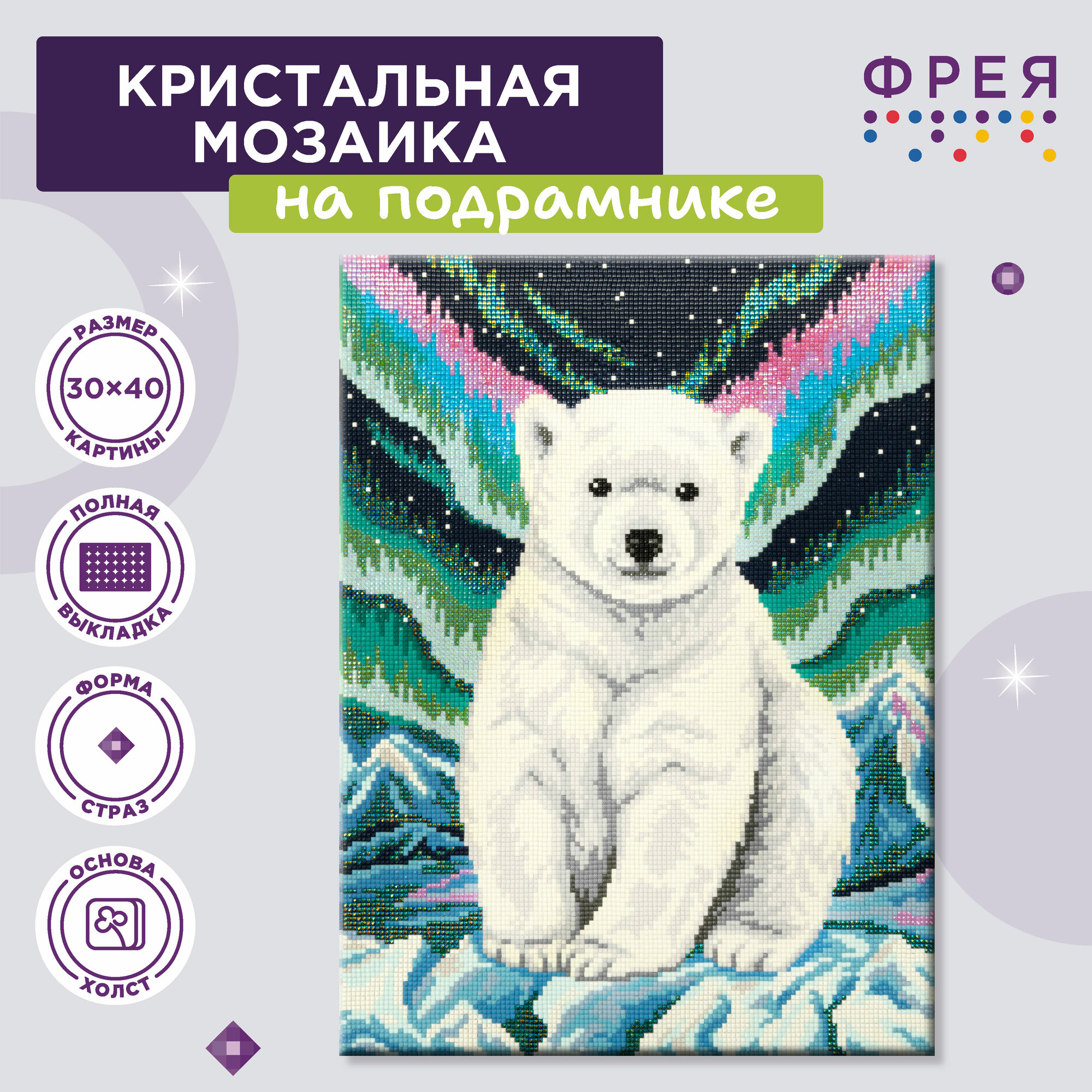 Алмазная мозаика на подрамнике ALPD-017 Полярный мишка ТМ Фрея - это прекрасный набор для тех, кто увлечен творчеством и рукоделием. Размер готовой работы 30х40 см. Выполнение работы не требует специальных навыков, выкладывать картину очень легко и быстро, подходит для взрослых и детей: женщин и мужчин, девочек и мальчиков. Холст уже натянут на деревянный подрамник, поэтому вам не потребуется оформление в багет. В состав входят все необходимое: холст с клеевым слоем и защитной плёнкой, на деревянном подрамнике с подложкой, квадратные стразы: 22 цвета (с запасом 20%), пинцет, стилус и гель-клей для страз, пластиковый лоток, крепление, пакеты зип-лок. Благодаря тому, что под холстом находится подложка, исключается возможность провисания основы при выкладывании картины. Стразы наклеиваются поверх изображения со схемой на уже нанесенный клеевой слой. Полная выкладка.
