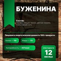 | Состав | свинина, шпик свиной, вода, нитритно-посолочная смесь (соль, фиксатор окраски-нитрит натрия), молочный белок, крахмал картофельный, клетчатка, стабилизатор (пирофосфат), регуляторы кислотности (трифосфат и ацетат натрия), сахара (декстроза, мальтодекстрин), пряности и экстаркты пряностей (майоран, кориандр, тимьян, перец белый, мускат, сельдерей), усилитель вкуса и аромата (глутамат натрия), антиокислители. |
