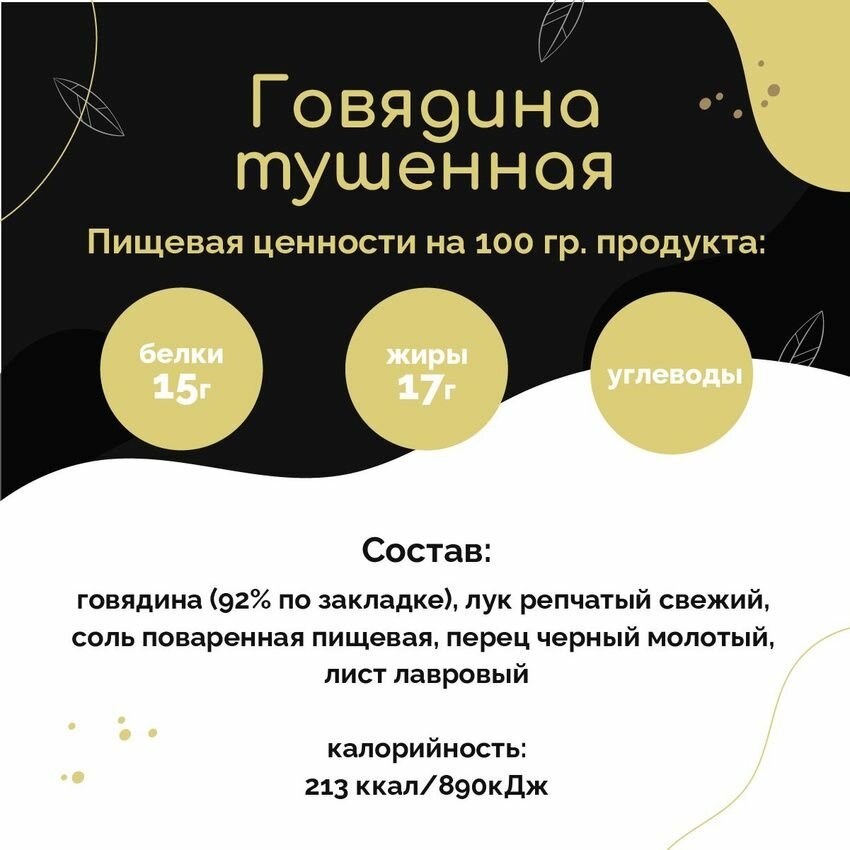 Состав: говядина (92% по закладке), лук репчатый свежий, соль поваренная пищевая, перец черный молотый, лист лавровый.