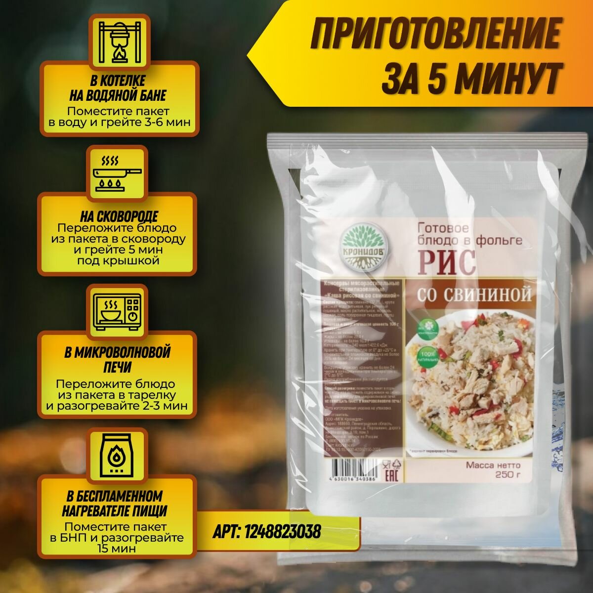 Рис со свининой "Кронидов" — это сытное и вкусное блюдо, которое станет настоящим находкой для любителей простоты и быстроты в приготовлении. Упаковка весом 300 граммов содержит идеально приготовленный рис, нежное мясо свинины и ароматные специи, объединенные в один восхитительный кулебяк. Это блюдо не только порадует ваши вкусовые рецепторы, но и обеспечит вас необходимыми питательными веществами. Состав данного готового блюда включает в себя свинину, рис, овощи, специальные приправы и растительное масло. В процессе приготовления завершений вы получите насыщенное и разнообразное сочетание текстур и вкусов, которое удовлетворит ваш голод и поднимет настроение. Рис со свининой — это отличная еда готовая в упаковке, чтобы быстро насытиться в условиях активного отдыха. Приготовление этого блюда также не требует особых усилий. Вы можете выбрать один из трёх простых способов: 1) поместите пакет в горячую воду на 5-8 минут, 2) выложите содержимое на сковороду и разогрейте до нужной температуры, или 3) поместите на тарелку и разогрейте в микроволновой печи (не забывайте, что пакет нельзя помещать в микроволновку!). Это делает его идеальным вариантом для приготовления еды в походе, когда у вас нет времени на длительные кулинарные эксперименты. Это блюдо наполнено важными питательными веществами: одно порция риса со свининой обеспечивает значительное количество белков, жиров и углеводов, что делает его отличным выбором для тех, кто нуждается в энергии в дни активного отдыха. Рис со свининой идеально подойдет для еды готовой для походов, будь то рыбалка, кемпинг или длительная прогулка. Не забудьте взять с собой ложку, вилку и нож для похода, чтобы с комфортом насладиться этим вкусным блюдом. Вы также можете использовать рис со свининой как часть набора готовой еды, добавляя разнообразие к своему рациону вне зависимости от условий. Покупая рис со свининой на распродаже, вы можете порадовать себя и своих близких качественным и вкусным питанием, которое легко взять с собой. "Кронидов" делает ваши блюда простыми и доступными, чтобы каждое ваше путешествие стало незабываемым, полным вкуса и комфорта!