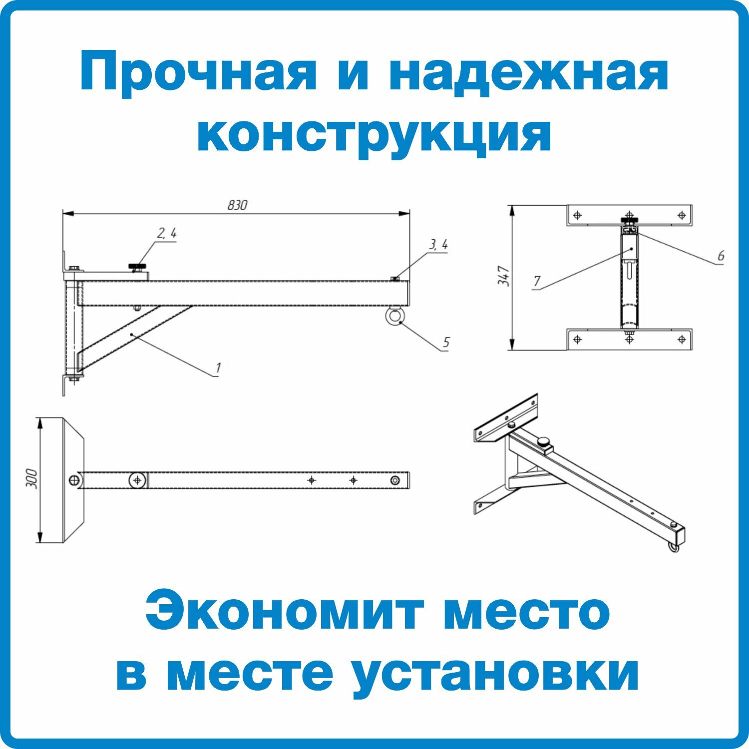 Выносная консоль соединяется сверху и снизу с двумя стальными уголками, прилегающими к стене в результате монтажа. В уголках насверлены по три отверстия в ряд под анкер-болты. Перпендикулярно выносу приварена труба, выполняющая роль опорной оси вращения консоли. В трубу сверху и снизу вварены гайки. Через болты кронштейн соединяется с монтажными уголками и фиксаторным профилем, имеющим сверху продольную фрезеровку. Для того чтобы откинуть кронштейн к стене, достаточно просто открутить верхний фиксаторный болт и отвести консоль в нужную сторону. Чтобы фиксатор не потерялся, можно оставить его в верхней прорези.