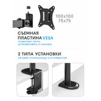 Механизм: Шарнирный. Крепление для монитора поддерживает установку 2 способами: установка через отверстие в столе или на струбцину (зажим с края стола). При установке в стол: подойдет толщина рабочего стола от 10 до 40 мм, на струбцину от 10 до 85 мм.