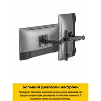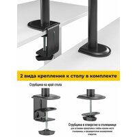 Настольный кронштейн для двух мониторов iTECHmount MBS10-12F поможет быстро и надежно одновременно установить 2 монитора или телевизора на столе. Каждое посадочное место данной модели кронштейна рассчитано на мониторы и телевизоры диагональю от 17” до 32”, с максимальным весом каждого устройства до 9 кг. 4 степени свободы, позволят регулировать угол наклона каждого монитора в диапазоне 45° вверх и 45° вниз, угол поворота экрана 90° влево/90° вправо, расположение экрана по высоте до 407 мм от основания кронштейна, а функция вращения экрана даст возможность легко менять ориентацию положения экрана из горизонтальной в портретную и обратно. Данная модель кронштейна оборудована струбциной, которая позволит легко закрепить кронштейн на краю стола и так же легко, в случае необходимости, быстро перенести его на другое рабочее место. Крепление для отверстия в столешнице также позволяет закрепить кронштейн в любом месте столешницы через отверстие в ней. Наличие кабель-канала позволит избежать беспорядка из свисающих и спутанных проводов, которые подключаются к устройству. Благодаря тщательно продуманному устойчивому основанию кронштейна, Вы можете быть уверены в безопасном размещении вашего устройства на столе, а в случае необходимости, сможете быстро и легко перенести кронштейн с устройством на другой стол.