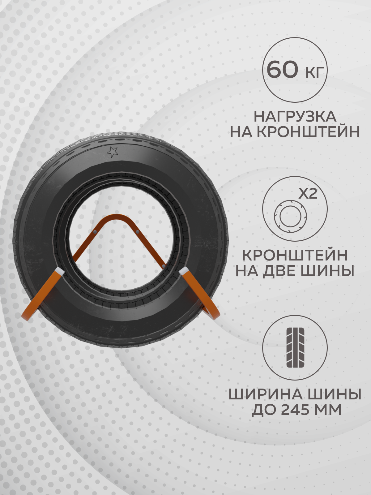 Настенный кронштейн для хранения шин позволяет эффективно сэкономить полезную площадь, обеспечивая бережное размещение шин для гаража, для дачи, для балкона и лоджии, а также для склада, мастерской и даже на улице. Система хранения авто колес вмещает 4 автомобильные покрышки без дисков шириной до 245мм каждая, не деформируя их и отлично заменяя собой полки любого стеллажа. Прочная и надежная металлическая конструкция настенной полки выдерживает большой вес - до 60 кг, позволяя сложить также лодку, велосипед, спортивный велосипедный инвентарь и инструменты. Держатель для колес автомобиля также подойдет для аккуратного оформления мест продажи резины в торговом зале или как стеллаж на производстве. Готовые отверстия, а также наличие необходимых саморезов и дюбелей в комплекте делают монтаж кронштейна для шин простым и быстрым. Для хранения комплекта автомобильной резины без дисков из 4 штук необходимо приобрести 2 подобных держателя.