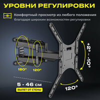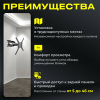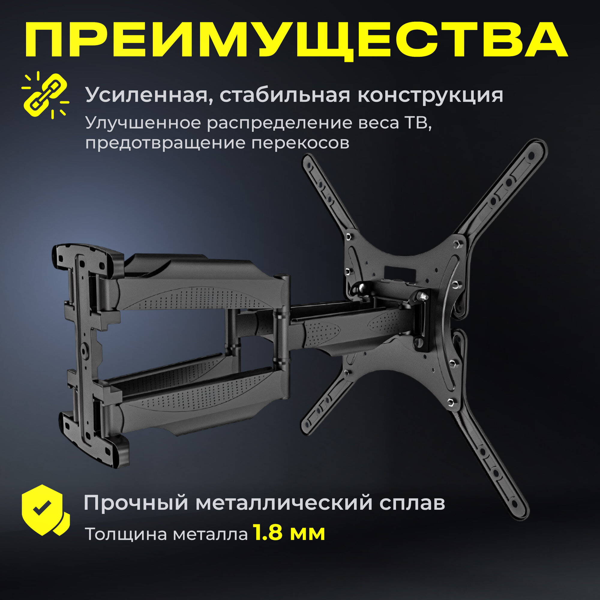 Метод установки на стену не только освобождает место, но и придаёт интерьеру современный вид. Кронштейн выполнен в строго черном цвете, который легко вписывается в различные стили оформления, от минимализма до хай-тек. Для обеспечения надежности и долговечности, максимальная нагрузка, поддерживаемая данным кронштейном, составляет целых 40 кг. Это делает его подходящим не только для телевизоров, но и для более тяжёлых экранов, таких как профессиональные мониторы.