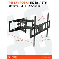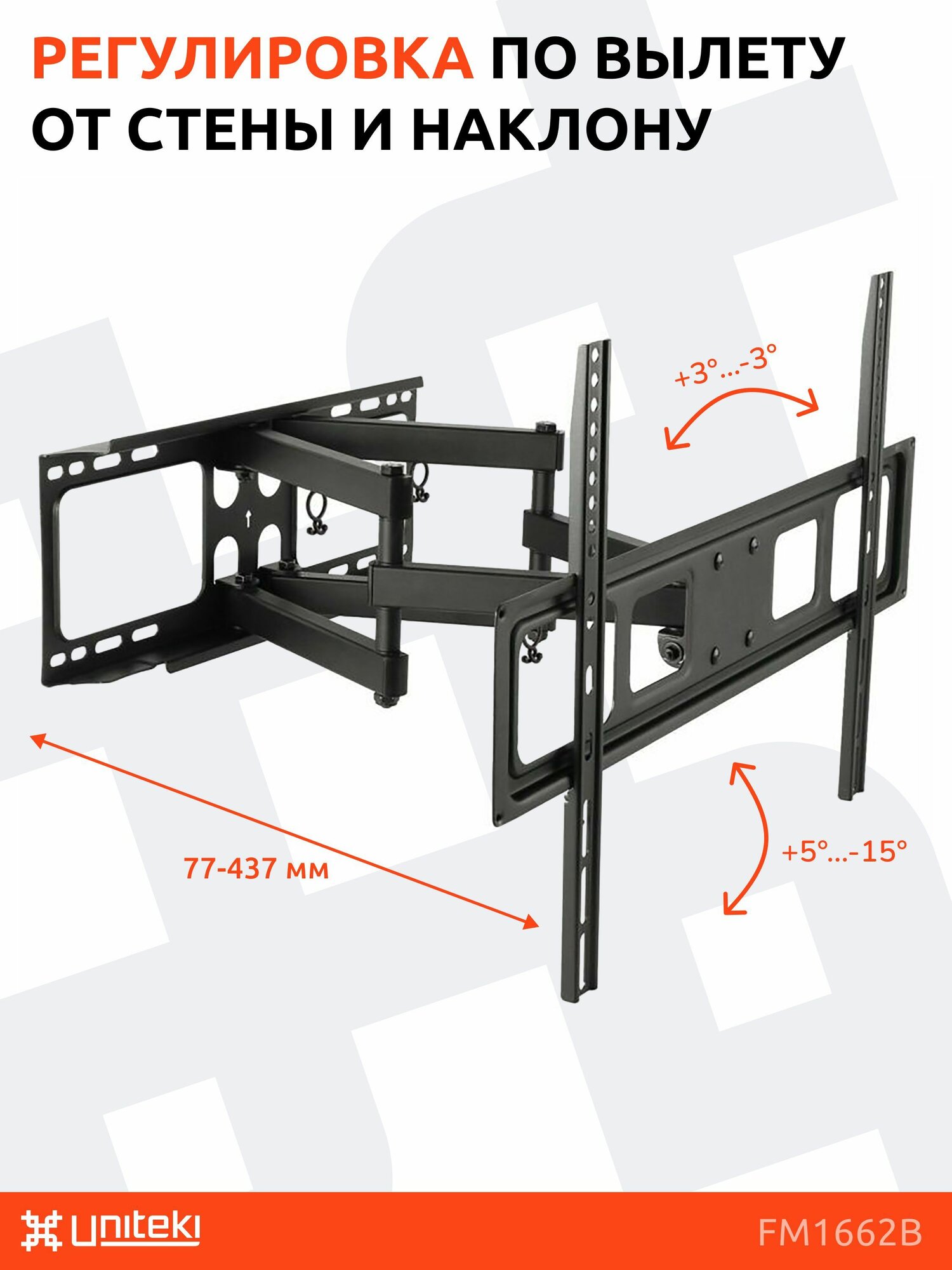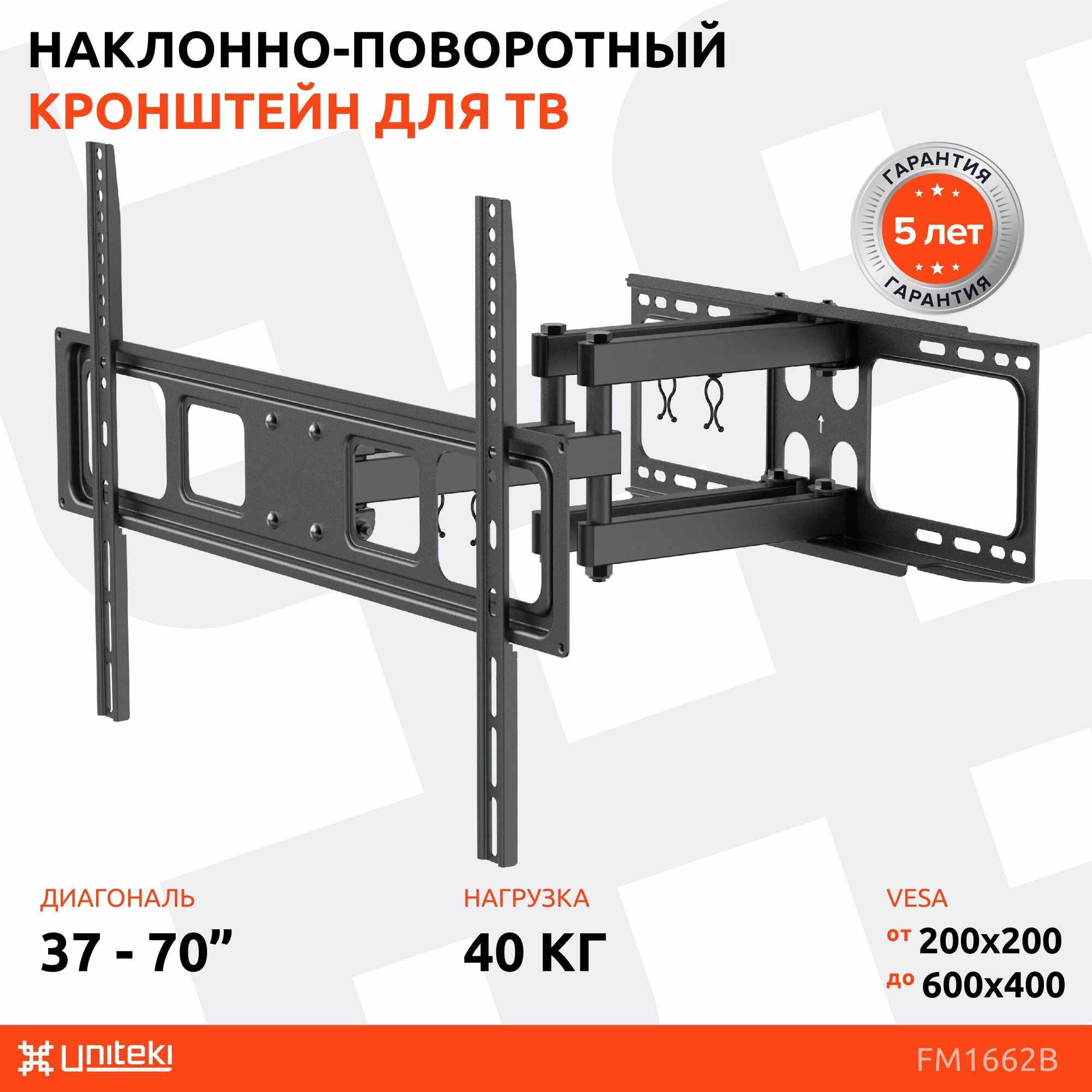 Настенный наклонно-поворотный кронштейн UNITEKI FM1662B предназначен для телевизоров с диагональю от 37 до 70 дюймов (см: 93 - 177), отлично подходит для современных ТВ с широкой линейкой диагоналей и большим весом, выдерживает до 40 кг. Увеличенная площадка крепления к стене обеспечит еще большую надежность вашей digital-панели и подарит чувство безопасности вам и вашим близким. Кронштейн является одним из самых маневренных в своей категории. Он обладает широчайшими возможностями наклона и поворота, предусматривает регулировку экрана по вертикали и горизонтали. Кабель-канал позволит зафиксировать провода для удобства и эстетичного внешнего вида. Кронштейн поставляется в оригинальной упаковке, с подробной инструкцией и широким набором креплений для настенной инсталляции.
