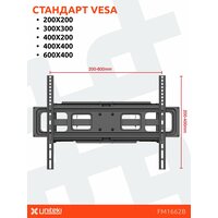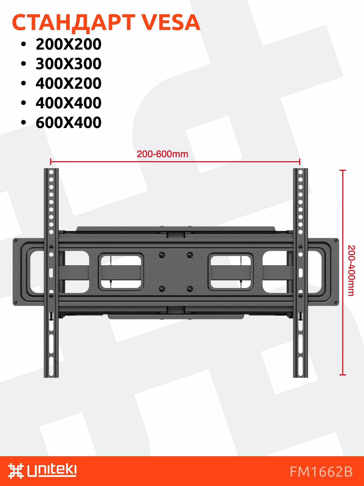 Крепежные отверстия VESA, (мм.): 200x200,200х300,300x200,300x300,200х400,300х400,400x200,400x300,400x400,500х400,600х200,600х300,600x400 мм.
