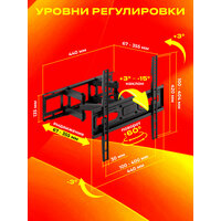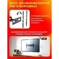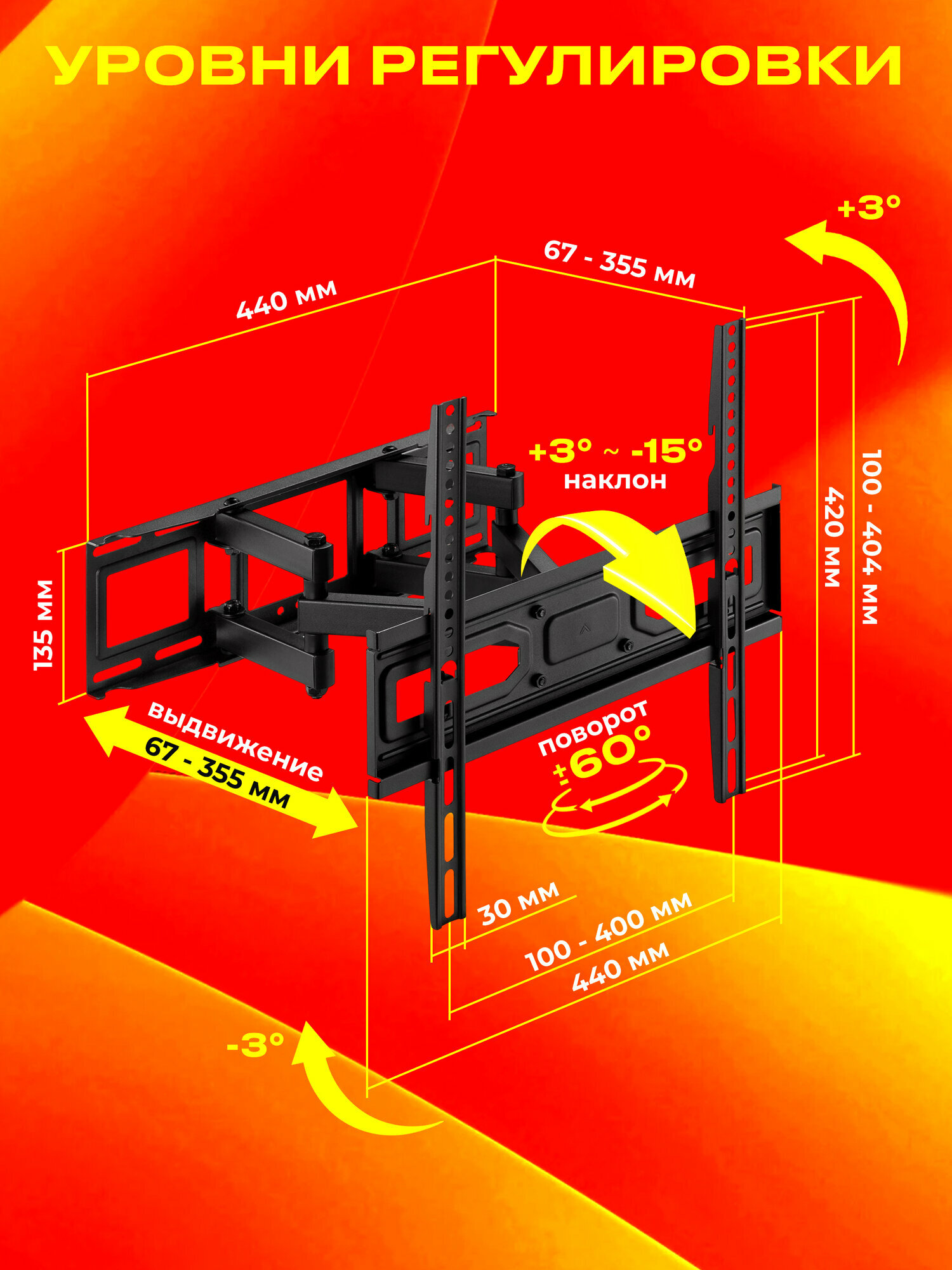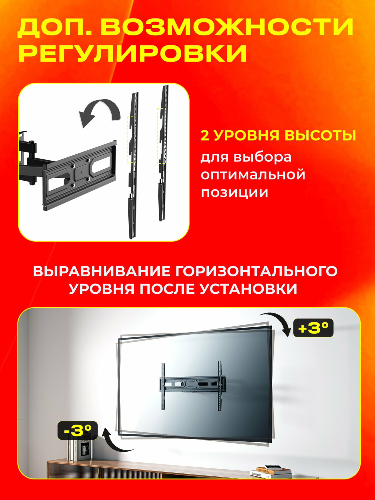 Угол наклона кронштейна составляет 18°, с возможностью регулировки от -15° до +3°, что позволяет оптимизировать положение экрана для комфортного просмотра. Угол поворота достигает 120°, с возможностью вращения от -60° до +60°, что обеспечивает гибкость в размещении телевизора в любой части комнаты. Кроме того, кронштейн позволяет корректировать уровень экрана на 6° (-3°~+3°), что помогает устранить любые небольшие неровности.