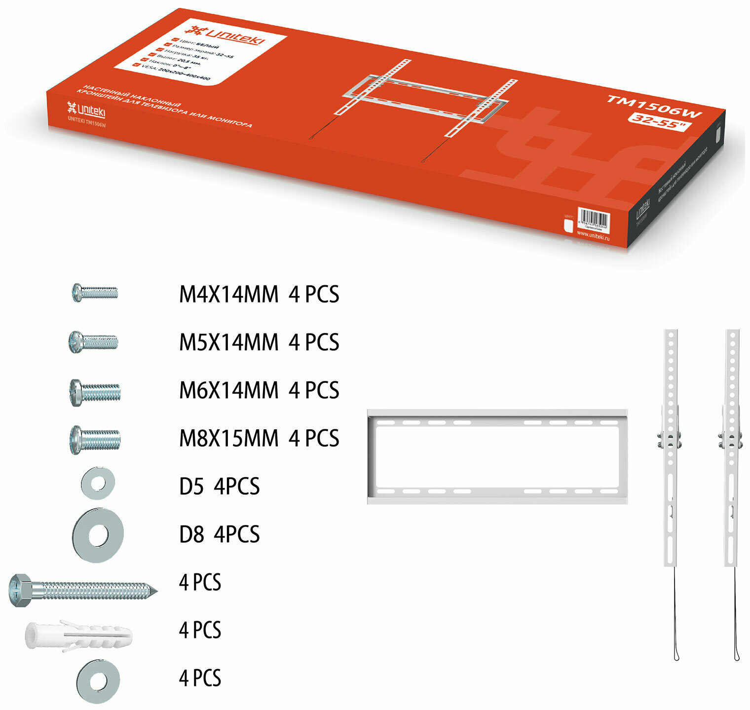 Настенный наклонный кронштейн UniTeki TM1506W предназначен для телевизоров с диагональю от 32 до 55 дюймов. Максимальный выдерживаемый вес составляет 35 кг, что делает кронштейн подходящим для достаточно больших digital-панелей. Крепление универсально за счет множества предусмотренных производителем размеров VESA – от 100x100 мм до 400x400 мм. Широкий выбор вариантов монтажных отверстий для установки на стену позволяет надежно зафиксировать кронштейн. Наклонный кронштейн TM1506W отвечает высочайшим стандартам качества. Он прочен и долговечен. Настенное крепление для телевизора надежно в работе и безопасно в регулировке. Система "Металлическая защелка" позволит Вам легко подвесить телевизор. Вы просто крепите основу к стене, а направляющие к телевизору. Затем навешиваете направляющие вместе с телевизором на основу и просто прижимаете до характерного щелчка. Готово! Телевизор надёжно зафиксирован, благодаря механизму-защёлке на направляющих. А когда надо будет снять телевизор, или произвести подключение дополнительных проводов, просто потяните за регулируемые по длине черные фиксаторы и можно отодвинуть или снять Ваш телевизор. Качественное исполнение придает кронштейну солидный внешний вид. Brand: UniTeki Тип кронштейна: Настенный наклонный для телевизора или монитора Материал: Сталь Диагональ экрана(дюймы), дюйм: 32 ~ 55 Диагональ экрана(см), см: 81 ~ 129 Угол наклона: 0 ~ -8° Максимальная нагрузка, кг: 35 Расстояние от стены, мм: мин. 20 Крепежные отверстия (VESA), мм: 100x100, 100x200, 200x100, 200x200, 200x300, 200x400, 300x100, 300x200, 300x300, 300x400, 400x200, 400x300, 400x400