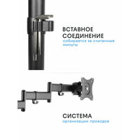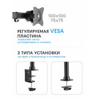 Крепление для монитора поддерживает установку 2 способами: установка через отверстие в столе или на струбцину (зажим с края стола). При установке в стол: подойдет толщина рабочего стола от 10 до 80 мм, на струбцину от 10 до 88 мм.