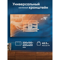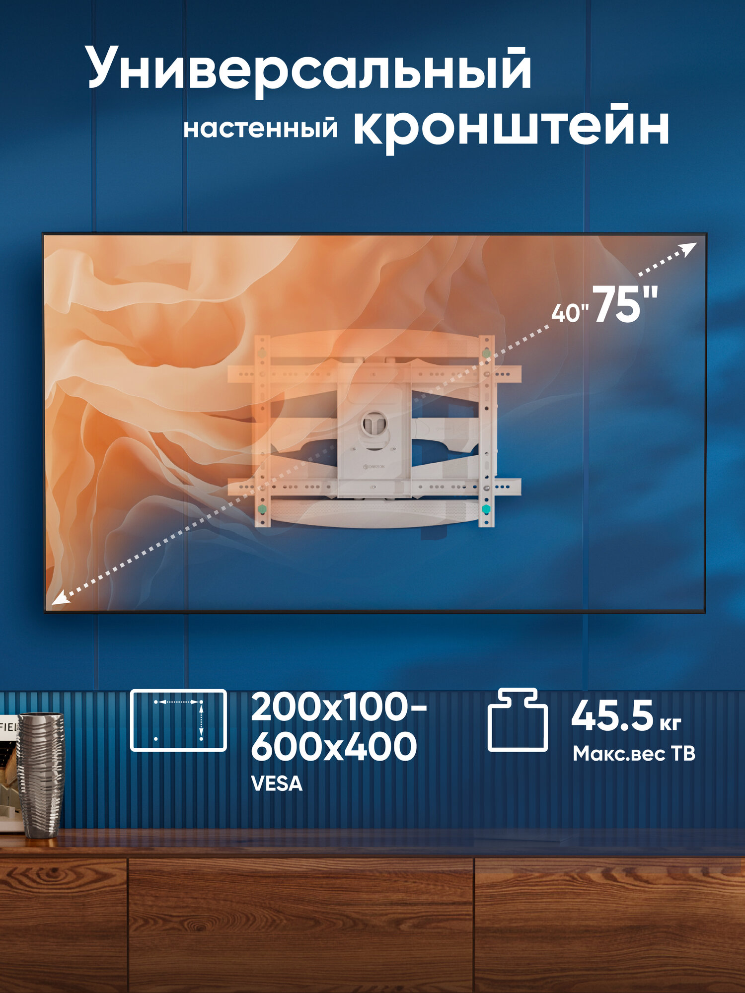 Настенный кронштейн для телевизора ONKRON M6L предназначен для крепления телевизоров с диагональю от 40 до 75 дюймов. Прочная конструкция с системой двойного плеча надежно выдержит экраны весом до 45,5 кг. Благодаря съемной VESA-панели, поддерживающей широкий диапазон VESA стандартов от 200x100 до 400x400, этот держатель для телевизора настенный является универсальным решением для многих современных экранов.