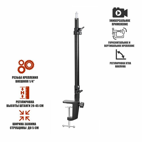 Кронштейн для видеотехники TSUS-14 - надежное и удобное решение для крепления вашей видеотехники. Телескопическая штанга позволяет легко регулировать высоту установки, а усиленная струбцина обеспечивает надежное крепление на различных поверхностях. Резьба 1/4 позволяет установить широкий спектр устройств. Будьте уверены в безопасности и надежности вашей видеотехники с кронштейном TSUS-14!