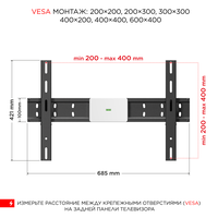 назначение: ЖК-телевизор, способ регулировки: фиксированный, диагональ ТВ: 42 " - 65 ", максимальная нагрузка: 40 кг, Стандарт Vesa: 600x400 мм, 200x200 мм, 300x300 мм, 400x400 мм, 400x200 мм, 200x300 мм