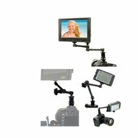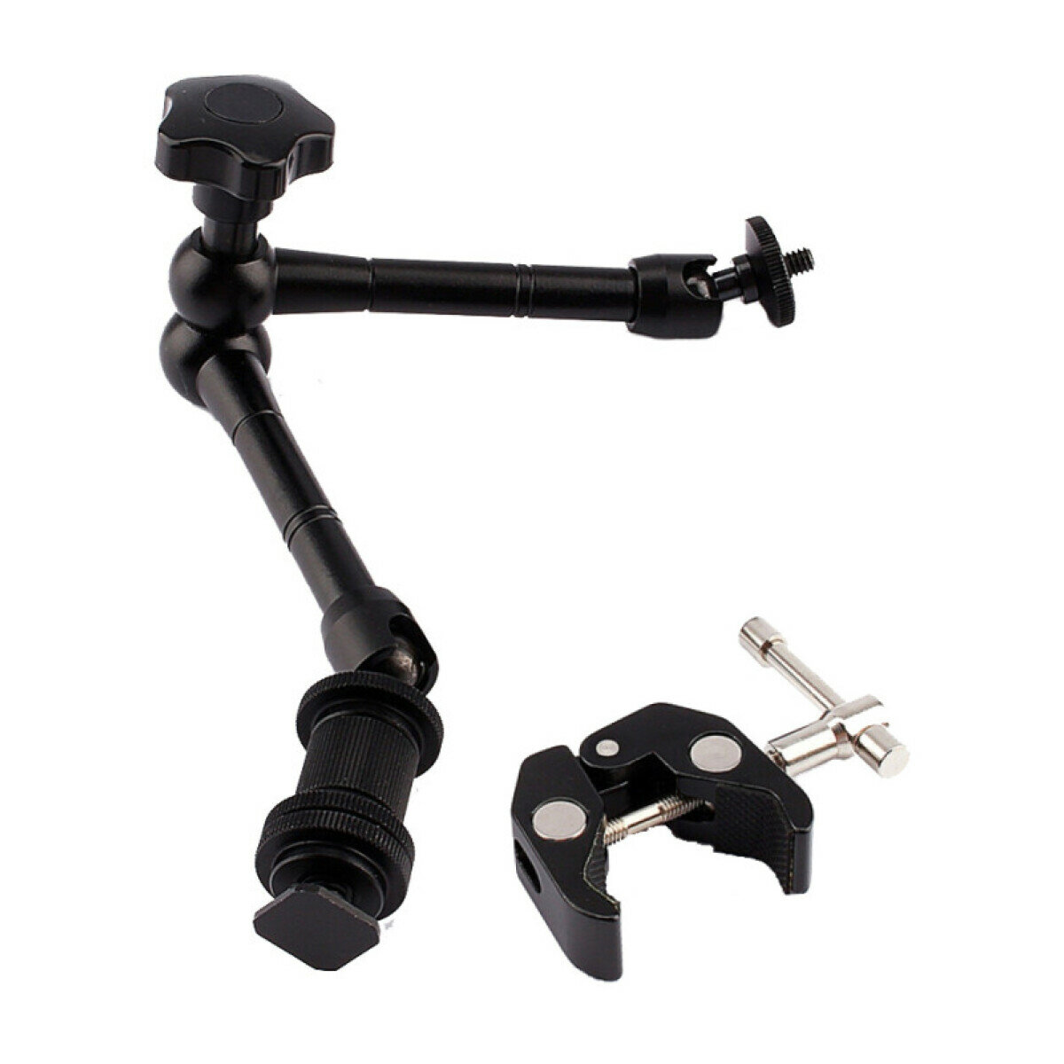 Комплект состоит из струбцины-зажима и трансформирующегося кронштейна Magic Arm 11. Имеет горячий башмак и винт-адаптер с резьбой 1/4" (папа/мама). Размер - 28 см. Изготовлен из алюминиевого сплава и пластика.
