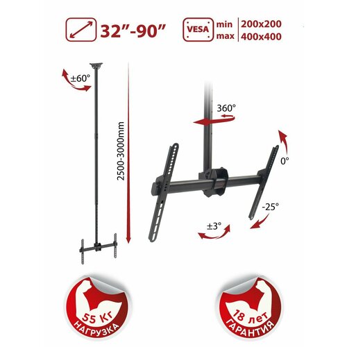 Профессиональный потолочный кронштейн для LED/LCD/PLASMA телевизоров 26"-65", max 55 кг, потолочный, 3 ст свободы, наклон 0-25°, поворот ±180, от потолка 2500-3000мм, max VESA 600x400 мм, телескопическая штанга возможность крепления на наклонный потолок