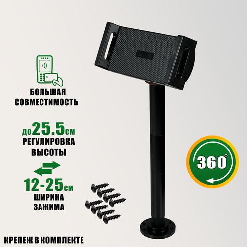 Держатель для платежного терминала - торговое оборудование, необходимое для размещения в любой торговой точке, магазине, банке, офисе, кассе и других местах с приемом оплаты. Терминал надежно крепится к держателю, который надежно крепит платежное устройство и дает гарантию отсутствия люфта и падения. С помощью шарнирного крепления становится возможным менять угол наклона держателя, что позволяет выбрать оптимальное положение. Основной особенностью держателя для платежного терминала является возможность выбрать высоту с помощью съемных переходников, это позволит адаптировать комплект под любые условия. Надежное основание крепится к поверхности при помощи саморезов, которые входят в комплект. Таким образом, данный аксессуар позволит зафиксировать платежный терминал, организовать пространство и сделать работу более удобной и эффективной. Особенности: - Держатель платежного терминала, планшета онлайн-кассы - Крепкая фиксация устройства - Регулировка высота за счет съемных переходников - Регулировка угла наклона и поворота за счет шарнирного крепления - Удобный и легкий монтаж - Саморезы для монтажа в комплекте