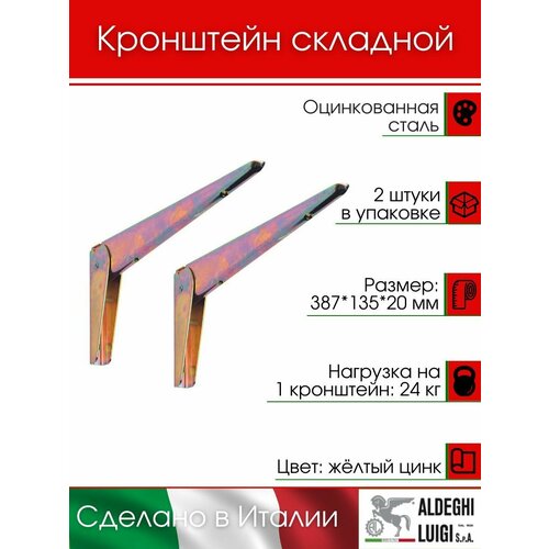 Купить Кронштейн складной ALDEGHI LUIGI SpA 387х135х20 мм, оцинкованный, цвет: жёлтая оцинкованная сталь 24 кг, 2 шт, 2530AT40_P8_U2 с доставкой по всей России. Кронштейн складной ALDEGHI LUIGI SpA 387х135х20 мм, оцинкованный, цвет: жёлтая оцинкованная сталь 24 кг, 2 шт, 2530AT40_P8_U2: сравнение цен, характеристики, фото, актуальное наличие и цены.