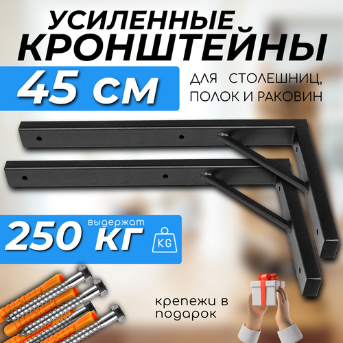 Кронштейны для столешницы, полки настенной усиленные 45 см в длину и 22 см высоту. Края заварены металлом, в отличии от более дешёвых аналогов с пластиковыми заглушками. Крепеж и колпачки в комплекте. Выдержит вес до 250 кг при правильном креплении на стену.
