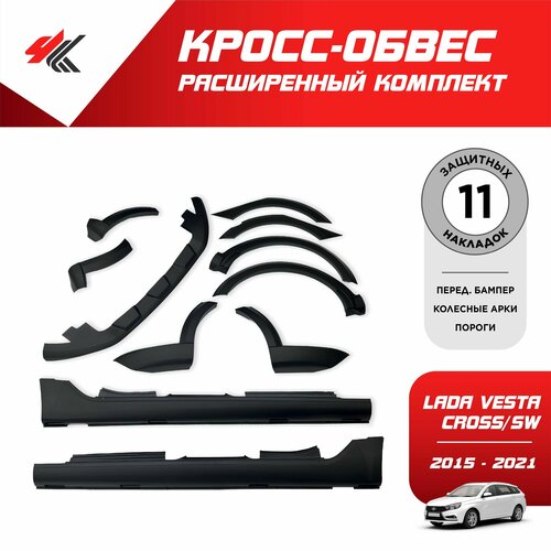Cross-комплектсостоит из 11 деталей и устанавливается на колёсные арки, а также пороги автомобиля и передний бампер. Монтаж изделий производится на заводские болты и двухсторонний скотч 3М. Чтобы правильно установить накладки, необходимо предварительно обезжирить предполагаемое место для установки и обработать поверхность праймером.