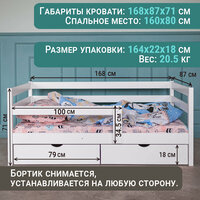 Безопасность ребенка обеспечивается благодаря закрытой боковине и защитному бортику. Бортик можно установить с любой стороны, в зависимости от расположения кровати в комнате. Максимальная нагрузка на кровать составляет 100 кг.