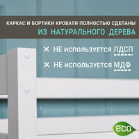 Кровать изготовлена из массива сосны, что гарантирует ее прочность и долговечность. Благодаря качественной шлифовке, поверхность кровати гладкая и приятная на ощупь.