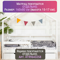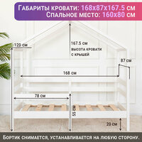 Удобная, компактная, надёжная, экологически чистая и безопасная кровать домик придётся по душе детям и родителям. Идеально подходит для детей от 3 до 12 лет, для мальчика и для девочки. Кровать с выкатными ящиками, они продаются отдельно. Одинарный бортик, устанавливается на левую или правую сторону, если нужно можно убрать совсем. Изготовлена из сосны (натуральное, гладкое дерево), все перекладины толстого сечения без использования МДФ или ЛДСП. Реечное основание под матрас скреплено лентой, что позволяет надежно установить его на кровать. Кроватка представлена в пяти цветах: натуральная (не окрашенная), белая, светло-коричневая, темно-коричневая, комбинированная бело-светлая. Размер спального места кровати 160 х 80. Габариты кровати ДхШхВ 168х87х167.5, высота кровати от пола до основания 20 см. Детская кровать от 3х лет. Ящики покупаются отдельно.