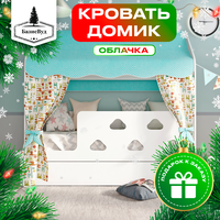 Купить Кровать детская домик с текстилем и ящиком (бирюзовый, с жирафиками) «Облачка» с доставкой по всей России.