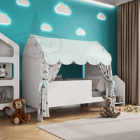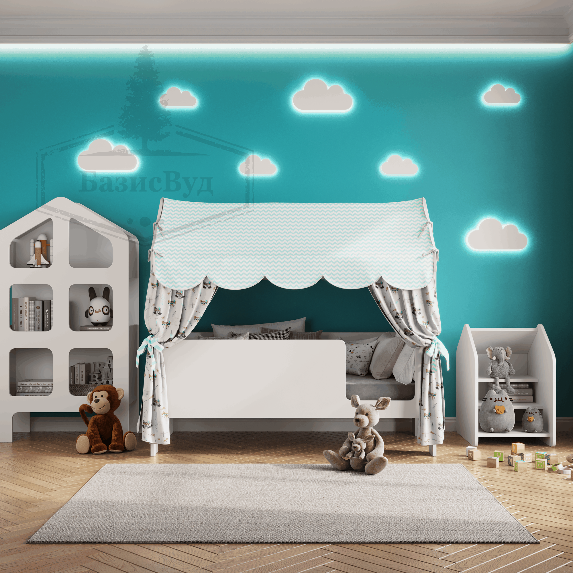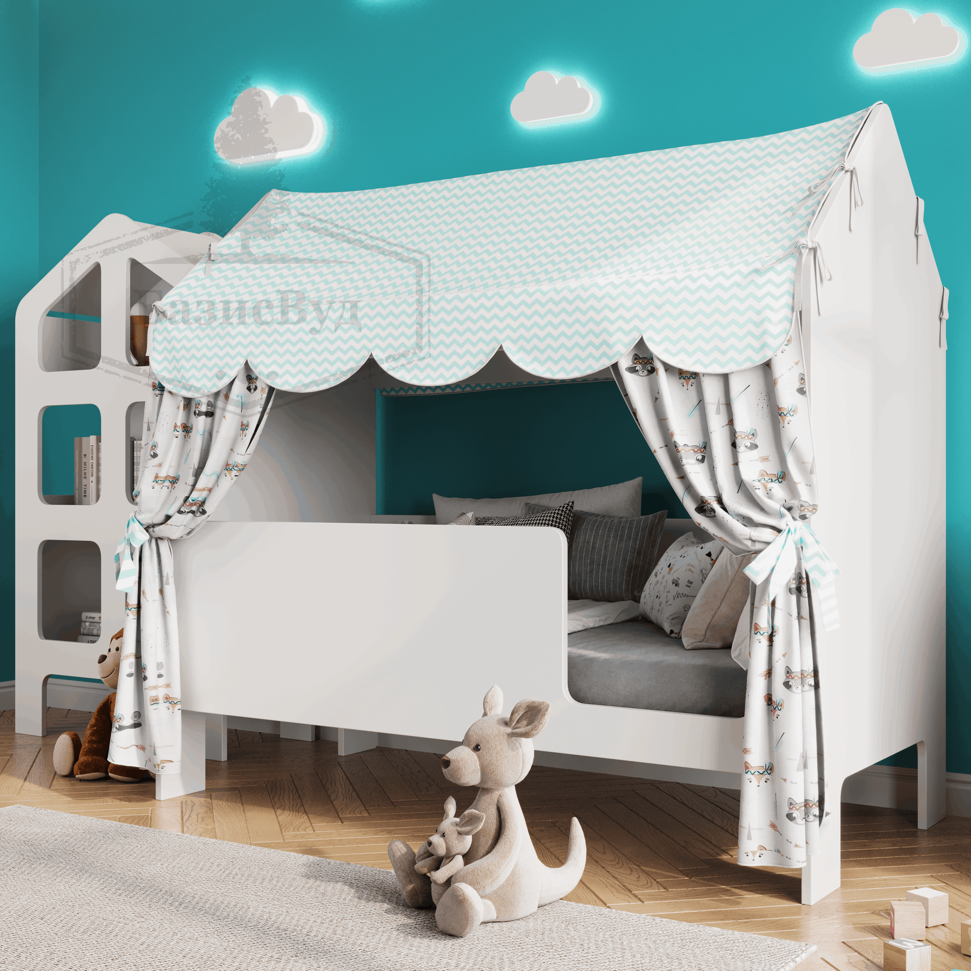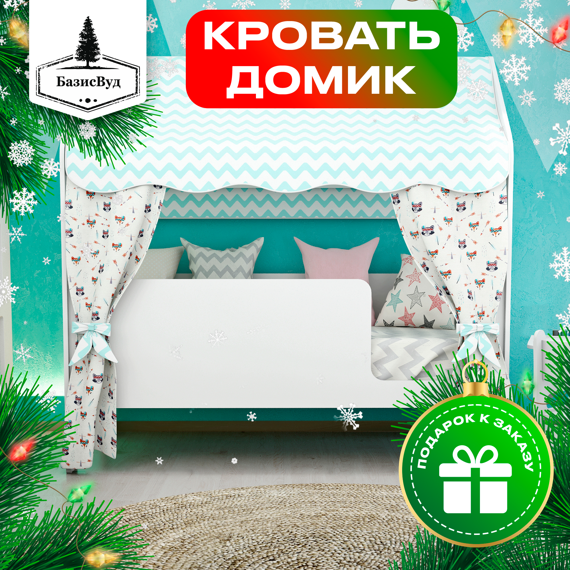Купить Кровать детская домик с текстилем (светлый со зверятами, вход справа) «Базовый» с доставкой по всей России.