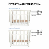 Регулируемая и съёмная передняя стенка: Передняя стенка регулируется по высоте и может быть снята, что позволяет использовать кровать в качестве приставной или облегчить доступ к новорождённому.