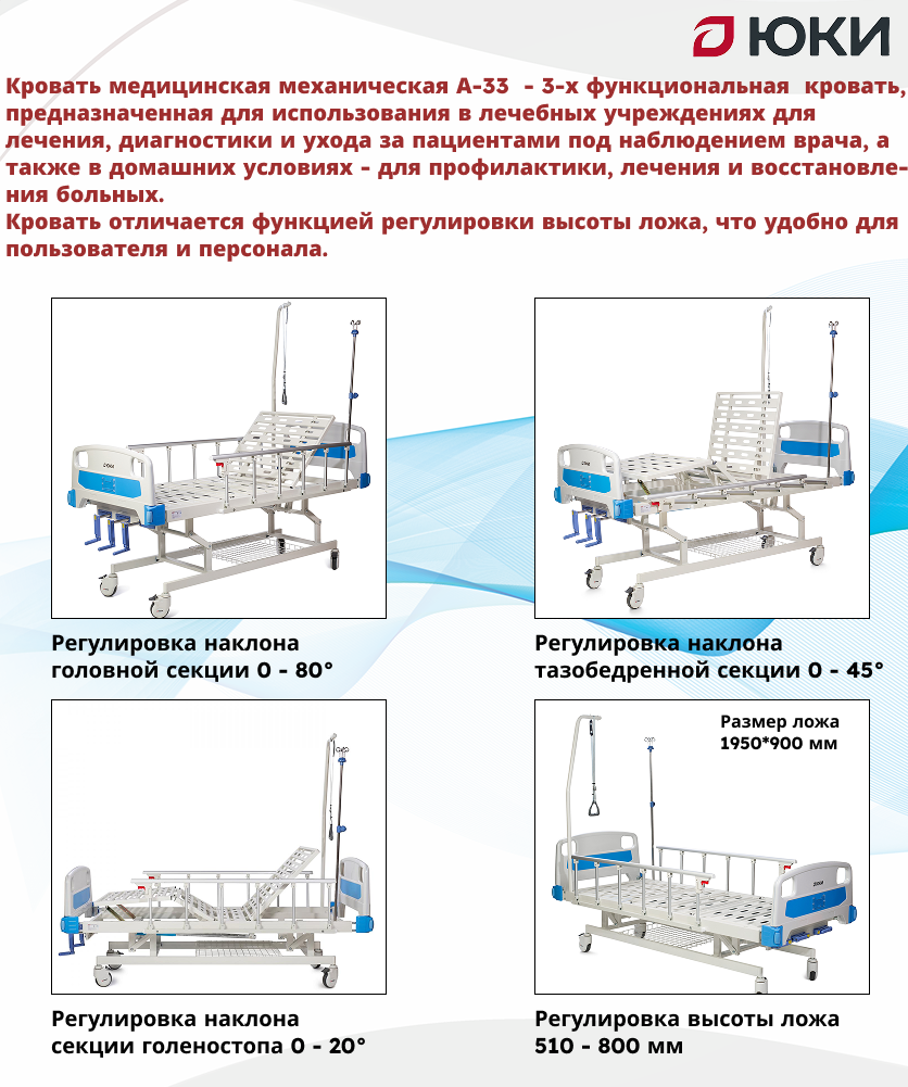 Кровать А-33 максимально проста в устройстве и сборке, применяются для эффективного ухода за пациентами в больничных палатах, клиниках, госпиталях, поликлиниках, санаториях.