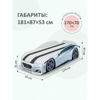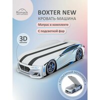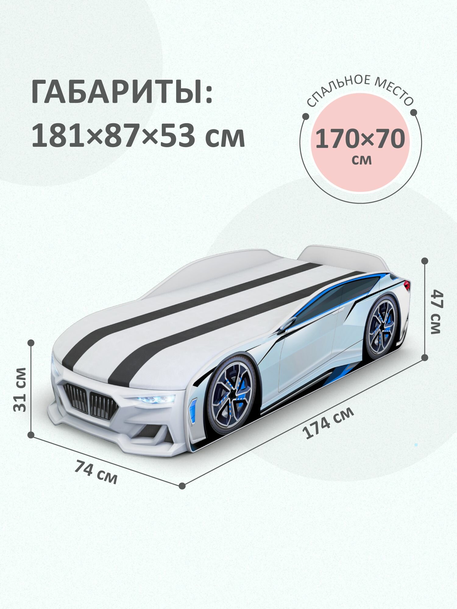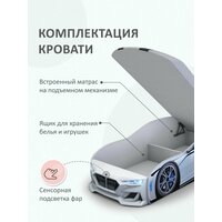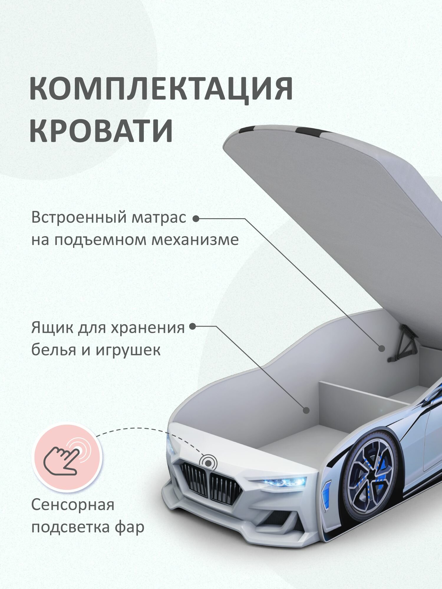 Кровать машина детская 170×70 Romack Boxter-New белая для мальчика с подъемным механизмом, ящиком для белья, объемным бампером и подсветкой фар: сравнение цен, характеристики, фото, актуальное наличие и цены.