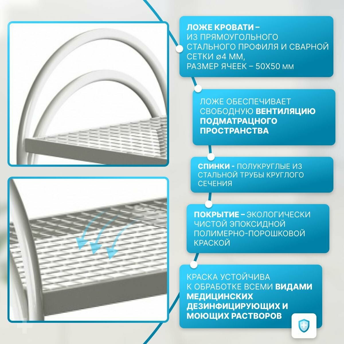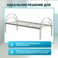 Кровать металлическая одноярусная. Очень удобная в сборке и комфортная для сна. Ложе кровати изготовлено из П-образного стального профиля и сварной сетки диаметром 4 мм, размер ячеек 50х50 мм, надёжно удерживает и обеспечивает свободную вентиляцию подматрацного пространства. Спинки – полукруглые из стальной трубы круглого сечения. Покрытие – экологически чистой эпоксидной полимерно-порошковой краской, устойчивой к регулярной обработке всеми видами медицинских дезинфицирующих и моющих растворов. Номинальная нагрузка – не более 130 кг. Масса – не более 23 кг.