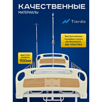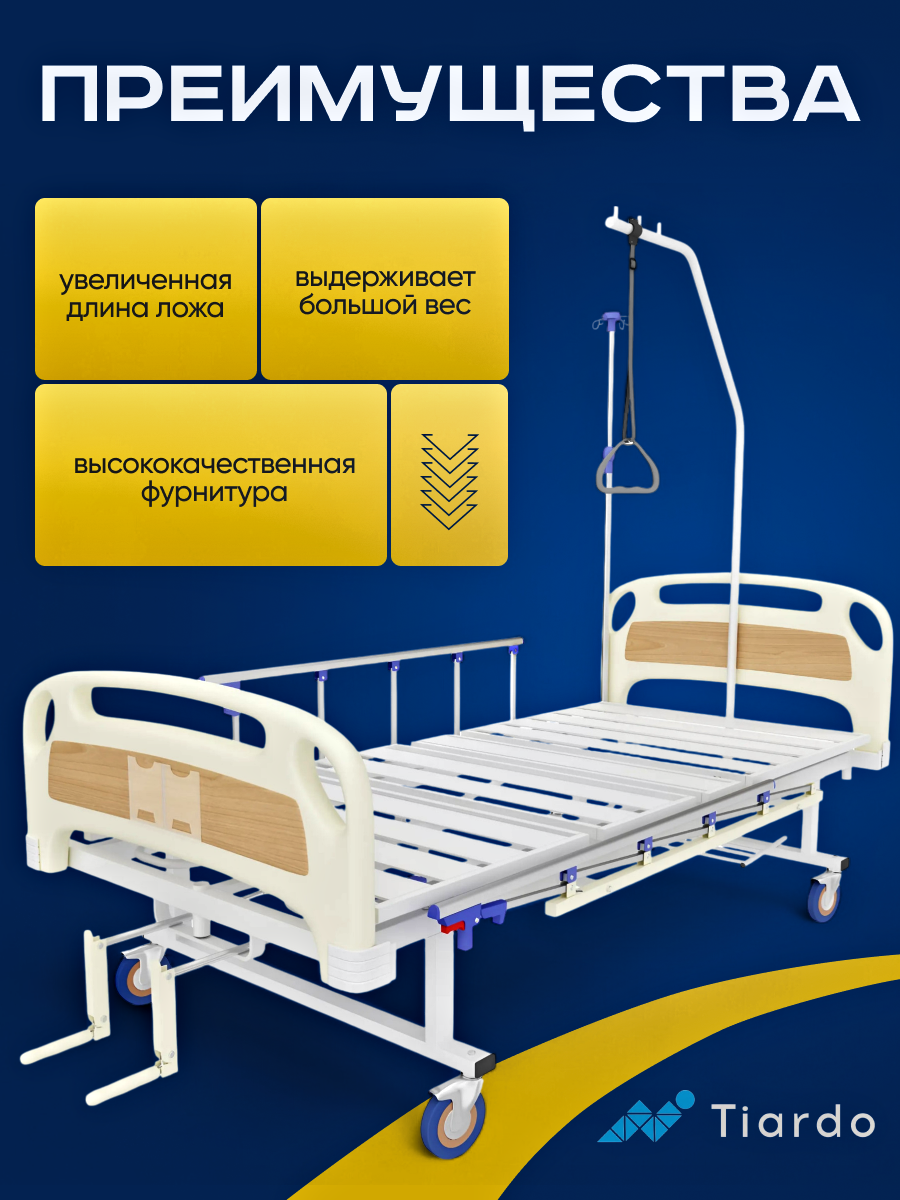 Медицинская кровать бренда Тиардо подходит для ухода за лежачими пациентами в стационаре или дома. Модель изготовлена из стали и оснащена механическим управлением. Роботизированная сварка каркаса гарантирует высокое качество сборки и долгий срок службы изделия при интенсивной эксплуатации. Одним из основных преимуществ кровати является четырехсекционное ложе с увеличенной длиной 196*89 см. Оно обеспечивает комфортное размещение пациента ( в том числе высокого роста) и выдерживает вес до 230 кг. Для обеспечения удобства при длительном пребывании в постели, предусмотрен расширенный диапазон регулировки угла наклона секций. Спинная 0-80°, тазобедренная 0-30°, голеностопная 0-17°. Такой диапазон обеспечит индивидуальный подбор оптимального положения пациента. Литые колеса с фиксацией делают перемещение кровати плавным и надежным. В случае необходимости кровать можно легко переместить или зафиксировать на месте. Колеса оснащены специальными стопорами, которые предотвращают непреднамеренные движения. Дополнительные функциональные элементы включают устройство для подтягивания пациента, что облегчает перемещение и адаптацию положения тела без посторонней помощи. Съемные складные боковые ограждения обеспечивают дополнительную защиту от падений и создают чувство безопасности у пациента. Также кровать оборудована устройством для капельниц, что упрощает процесс проведения медицинских процедур прямо у постели больного. Таким образом, обеспечивается полный уход без нарушения привычного режима лечения и комфорта пациента. Надежность и качество изделия подтверждено Росздравнадзором, а производство осуществляется в России. Весь производственный процесс контролируется на каждом этапе, что гарантирует высокое качество конечного продукта.