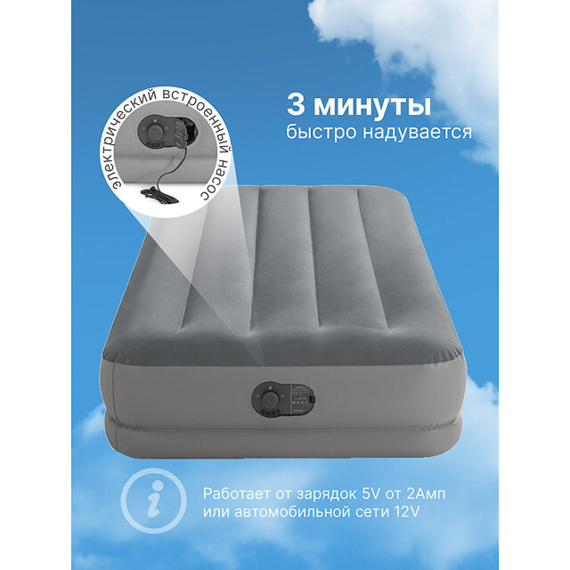 Надувной матрас "Intex 64112 Prestige Mid-Rise Airbed" . Дополнительное основание по периметру, создано для повышения стабильности конструкции. Применение технологии внутренних перегородок Fiber-Tech (полиэфирные волокна) обеспечит стабильность и надёжность конструкции, наделяет матрас необходимой жёсткостью, что обеспечит комфортный отдых. Приятное покрытие поверхности матраса, которое напоминает велюр, не даст соскальзывать постельному белью и легко чистится. Достаточно удобен в хранении и переноске. В сложенном виде не займёт много места в багаже и на полке. Матрас оснащён встроенным электрическим насосом "FastFill" с подключением через USB-кабель, работающий от телефонных зарядок 5В от 2Амп или автомобильной сети 12В. На его установку потребуется всего 3,5 минуты. Характеристики товара Длина: 191 см Ширина: 99 см Высота: 30 см Вес: 12.1 кг