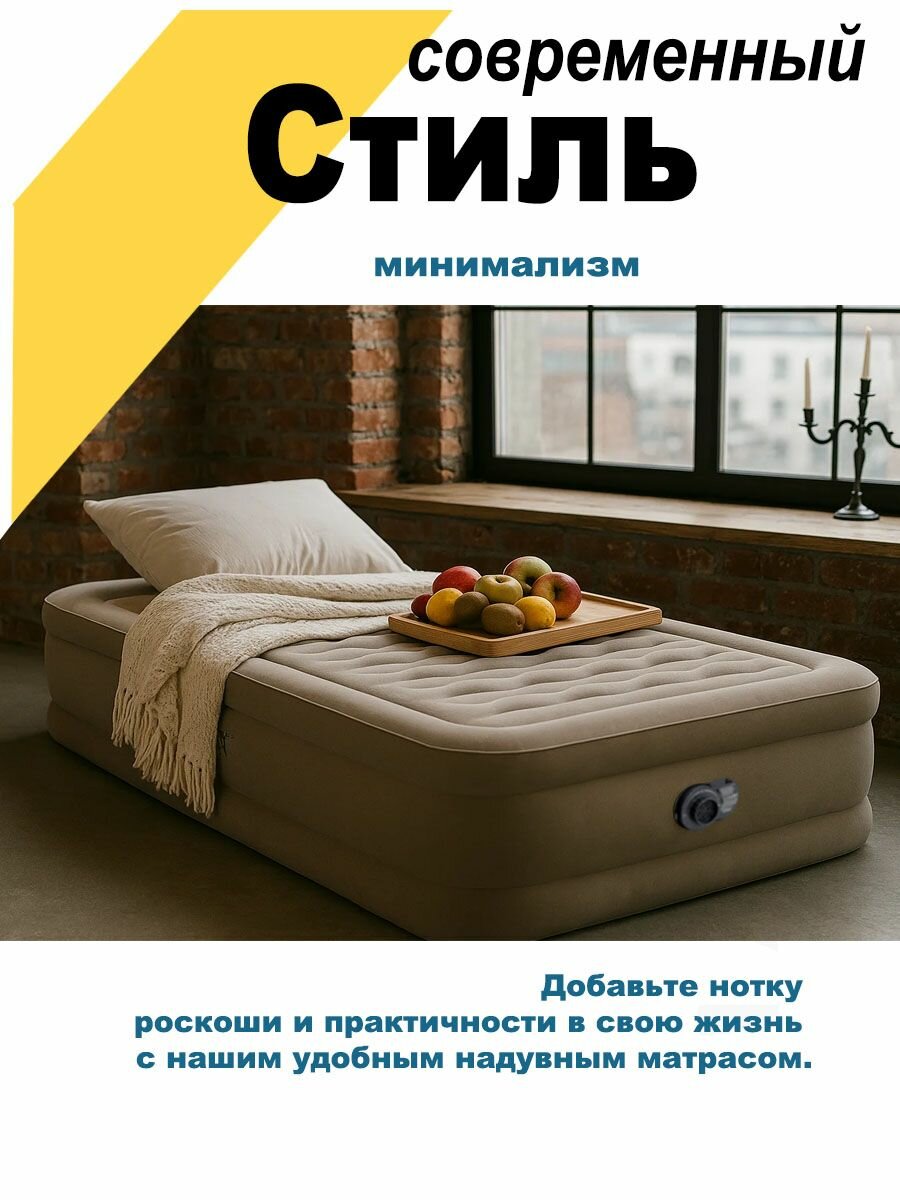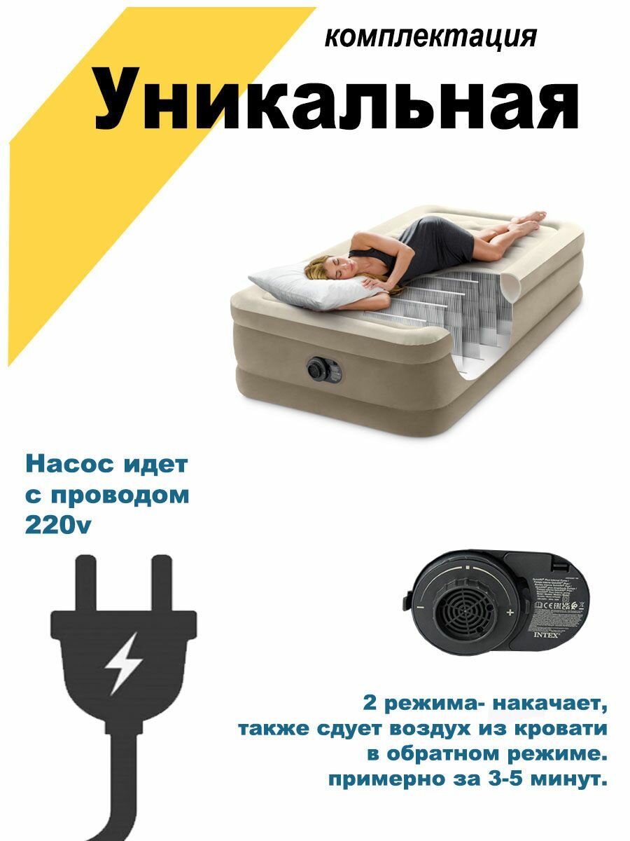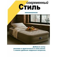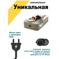 Надувная кровать мирового Бренда INTEX, производится под контролем американского бренда в Китае, что позволяет быть лидером по качеству и сроку службы изделий. Надувные кровати мобильны в использовании и позволяют экономить место и быстро перевезти с объекта на объект или временно разместить гостей. Верхняя часть кровати по своим характеристикам напоминает велюр, она очень приятна на ощупь и не позволяет постельному белью соскальзывать во время отдыха. Комфортная высота для сна на кровати считается 42 см и выше.