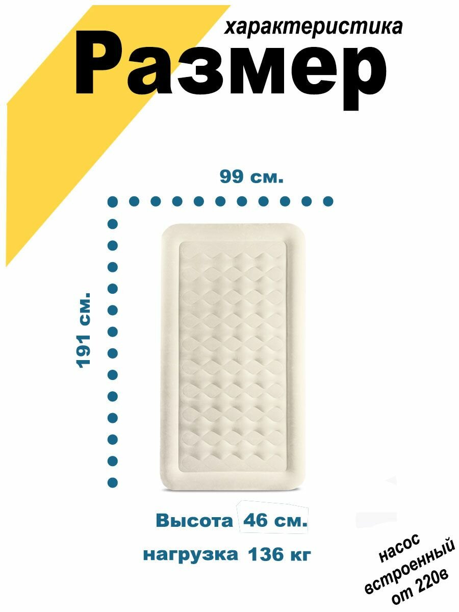 Встроенный насос позволит очень быстро за считанные минуты надуть и также есть обратный режим сдуть кровать! В комплекте с кроватью на всякий случай кладется ремонтный комплект. (Желтая маленькая наклейка, часто ее путают с рекламой бумагой, выкидывают, будьте внимательны и оставьте его)По качеству кровати, данные кровати служат до 10 лет, все зависит от бережности использования, на надувных кроватях нельзя прыгать, хранить на морозе и на сильном солнце в жару, внутри технология ниточная позволяющая комфортно спать и создавать анатомию для сна.