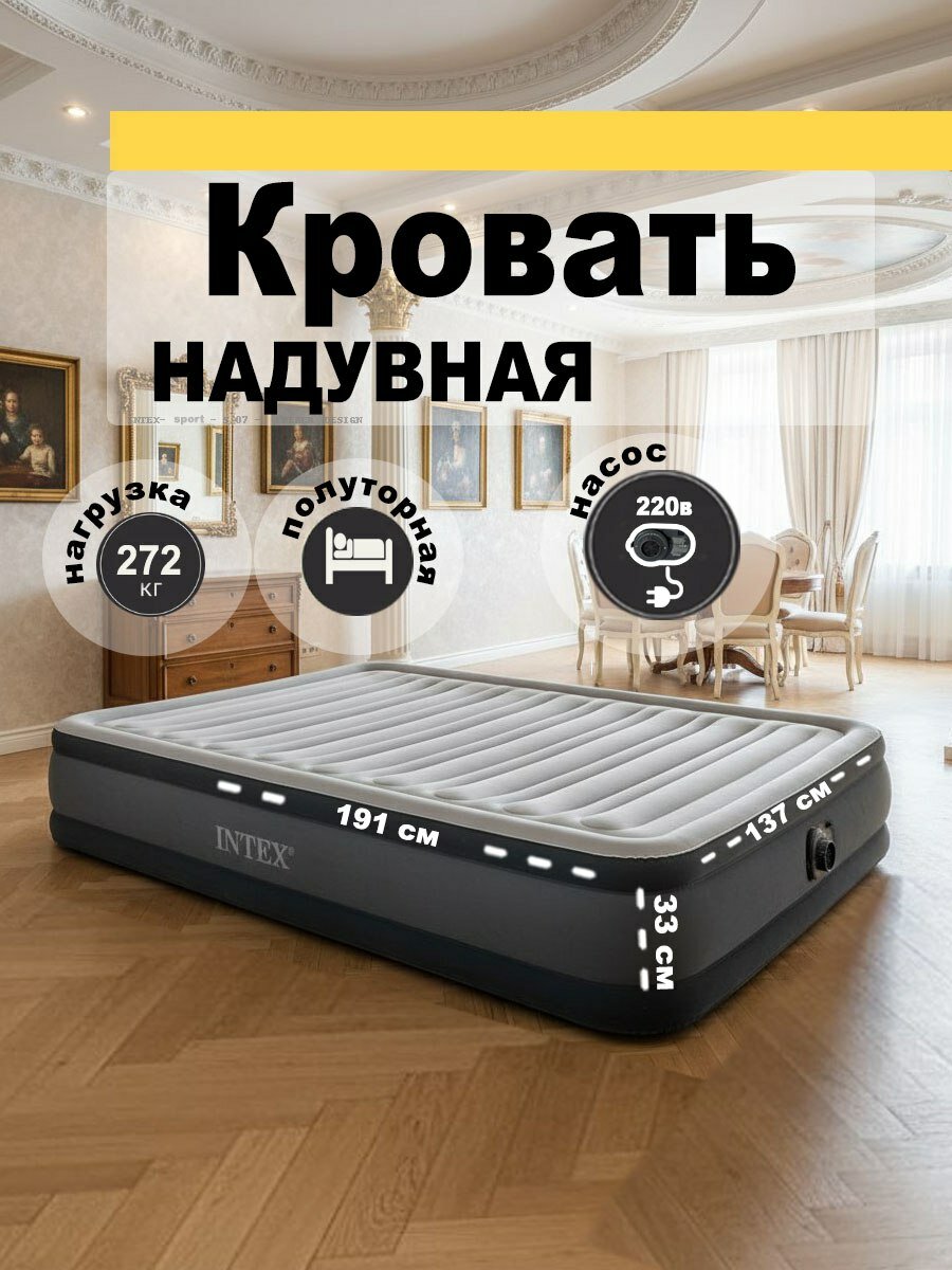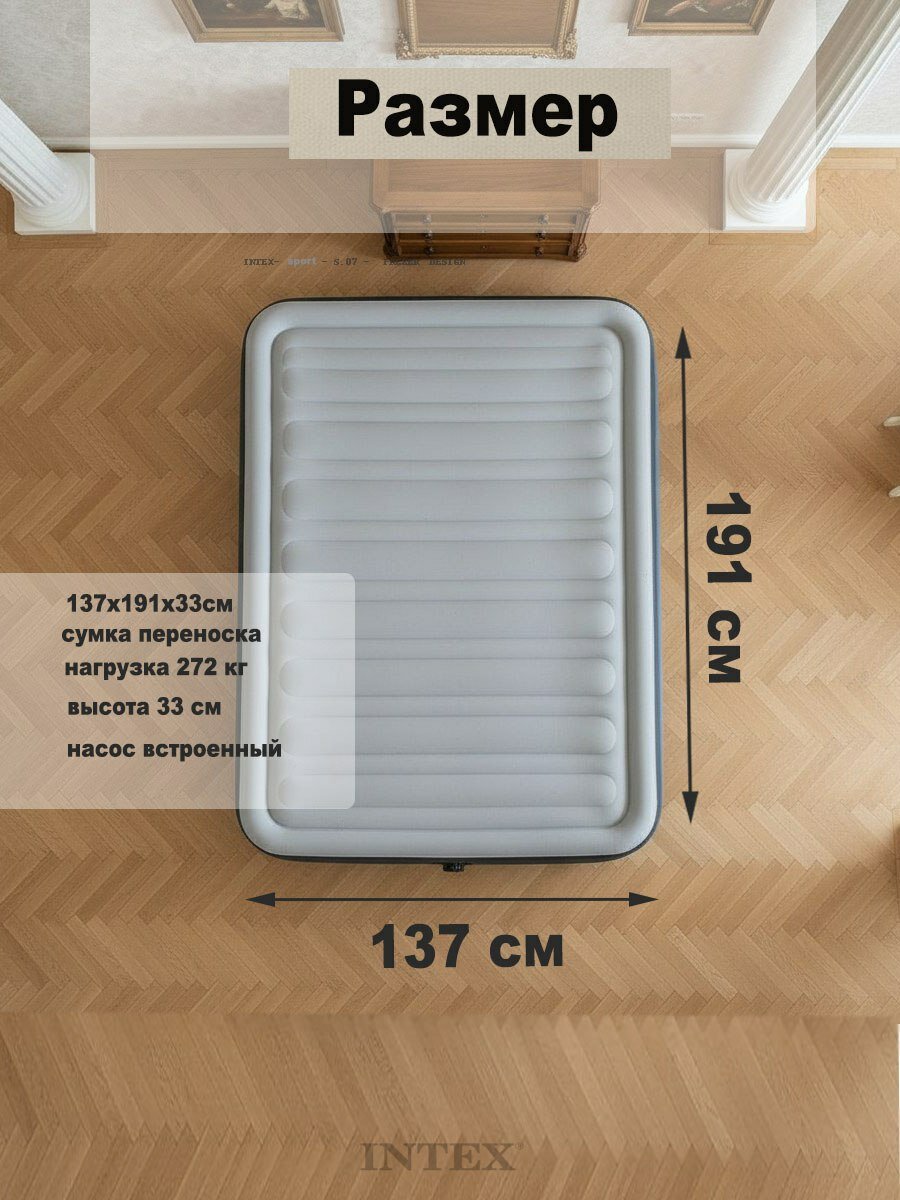 Надувная кровать мирового Бренда INTEX, производится под контролем американского бренда в Китае, что позволяет быть лидером по качеству и сроку службы изделий. Надувные кровати мобильны в использовании и позволяют экономить место и быстро перевезти с объекта на объект или временно разместить гостей. Верхняя часть кровати по своим характеристикам напоминает велюр, она очень приятна на ощупь и не позволяет постельному белью соскальзывать во время отдыха. Встроенный насос позволит очень быстро за считанные минуты надуть и также есть обратный режим сдуть кровать!