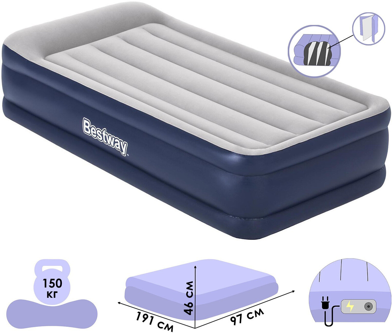 Кровать надувная Queen, для сна и отдыха, односпальная, велюровое покрытие, нагрузка до 150 кг, трехслойные перегородки, 191 x 97 x 46 см, со встроенным электронасосом, Bestway: сравнение цен, характеристики, фото, актуальное наличие и цены.