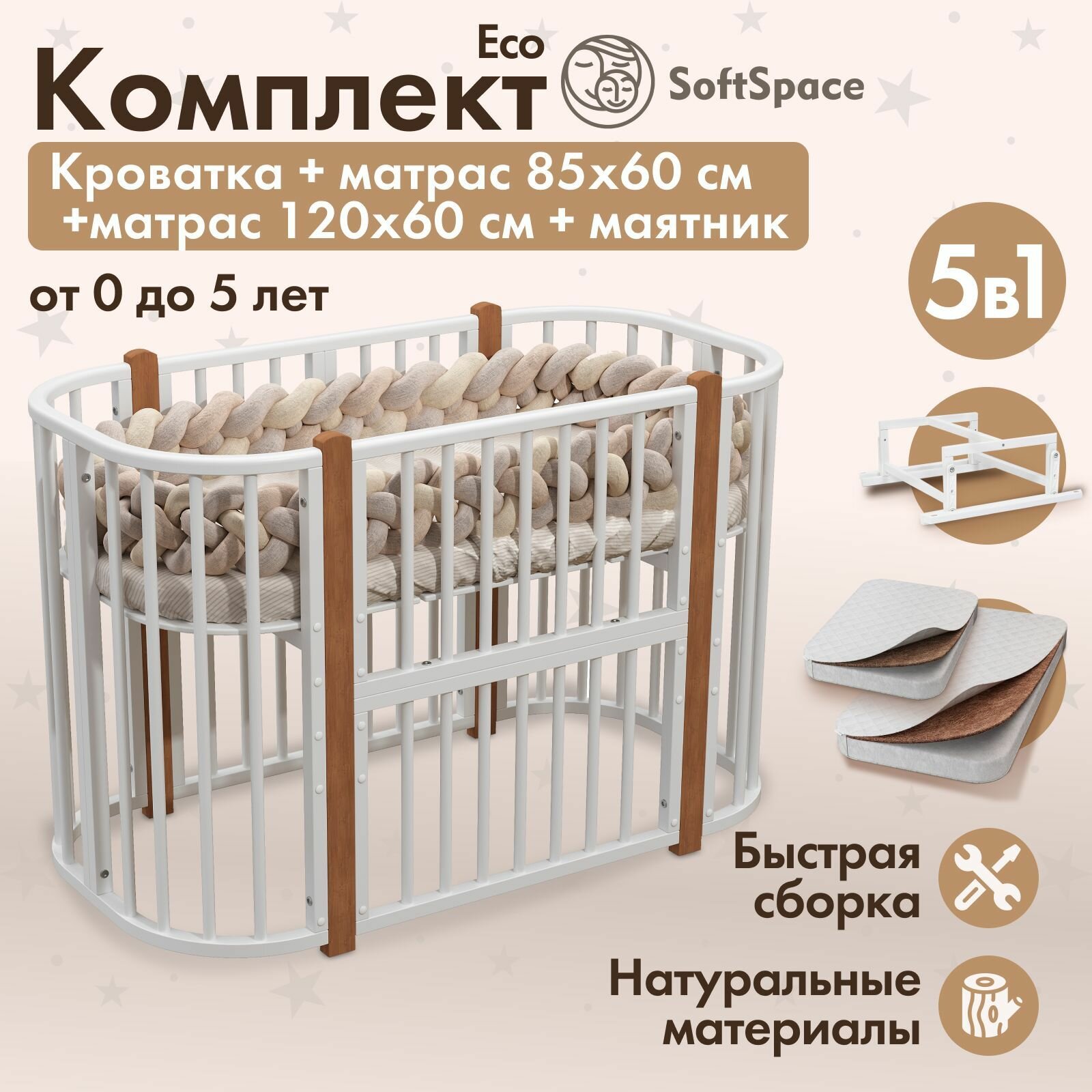 Кроватка детская для новорожденных, трансформер SoftSpace Eco 5 в 1, с матрасом 85*60 см, 120*60 см, с маятником, кроватка детская 120х60 см, люлька 85х60 см, белый с буковыми стойками: сравнение цен, характеристики, фото, актуальное наличие и цены.