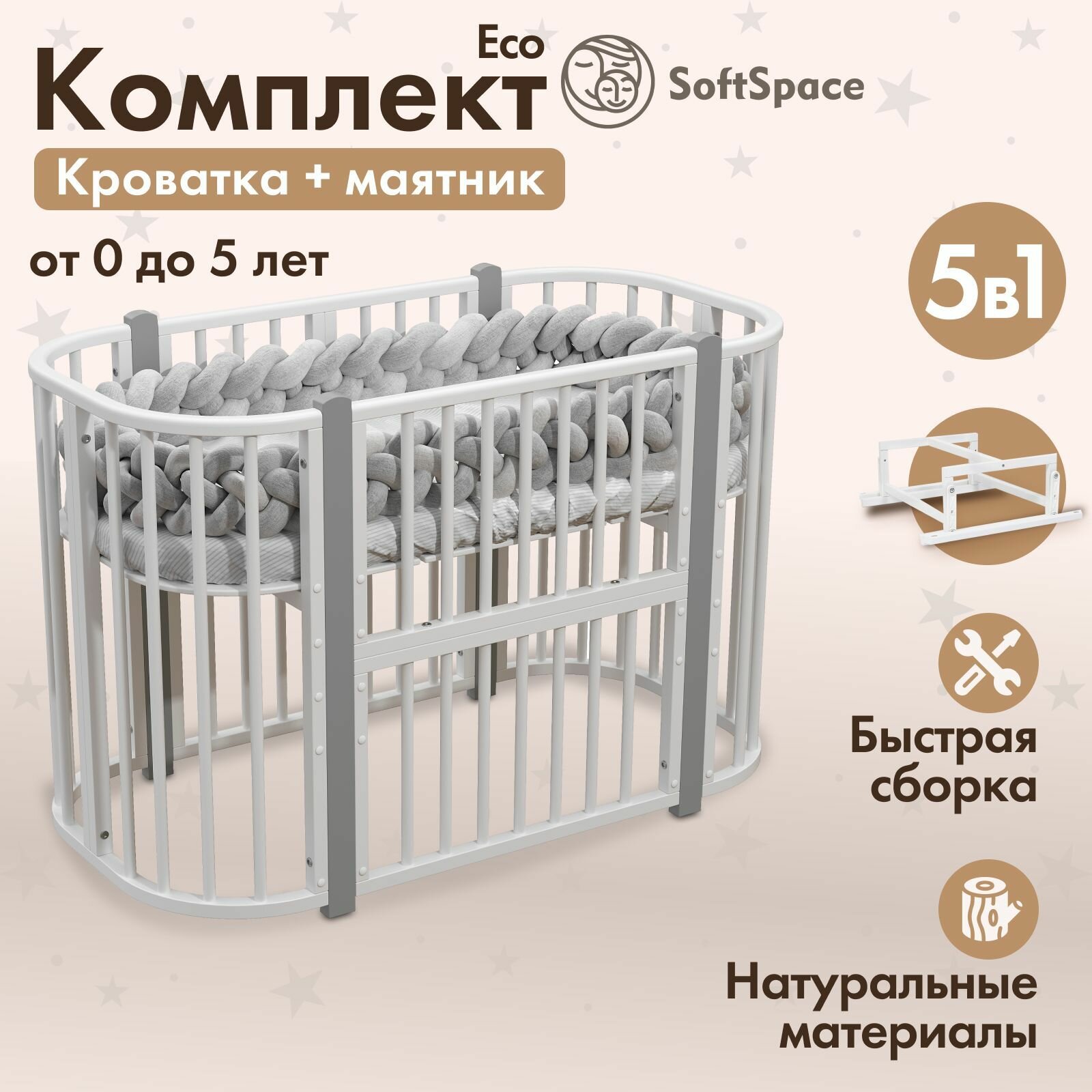 Кроватка детская для новорожденных, трансформер SoftSpace Eco 5 в 1, с маятником, кроватка детская 120х60 см, люлька 85х60 см, белый с серыми стойками: сравнение цен, характеристики, фото, актуальное наличие и цены.