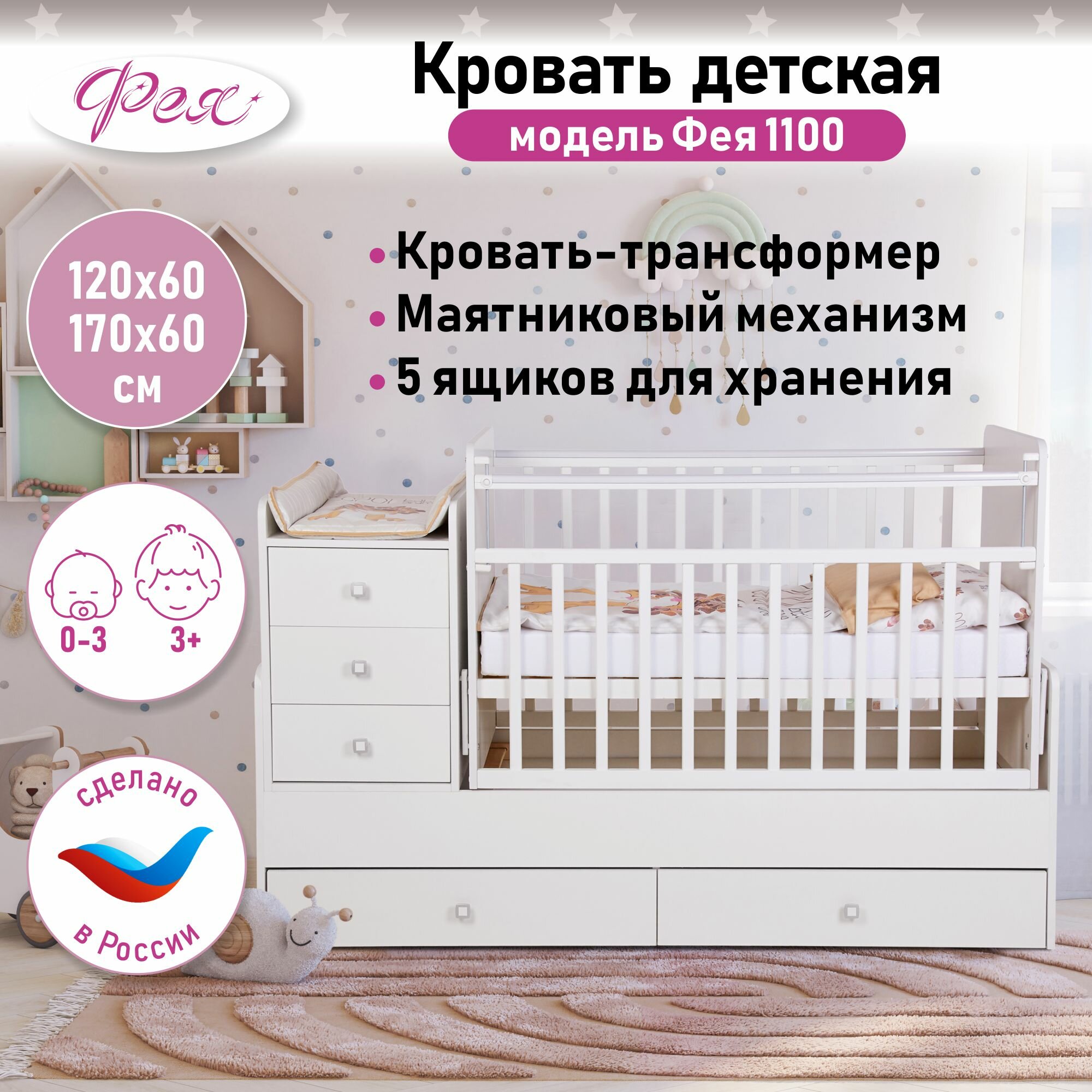 Кроватка Фея 1100 трансформер с комодом, поперечный маятник Белый: сравнение цен, характеристики, фото, актуальное наличие и цены.