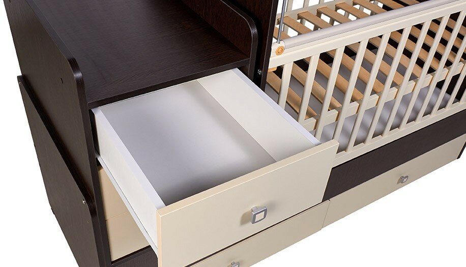 Материал - ЛДСП Вес (кг) - 81 кг Колесная база - Поперечный маятник - Продольный маятник - Колесо/качалка - Качалка - Откидная планка - Опускаемое ограждение - Опускаемое ограждение - Накладка ПВХ - Торцы покрыты прорезиненным шпоном - Встроенная тумба с пеленальной зоной - (BхШхГ) – 63 х 41,6 х 63,8 см Фасады - Уровней ложа - 2 Выдвижных ящиков - 2 под кроватью и 3 в комоде Габариты (см) - (ВхШхГ) – 110 х 173,2 х 63,8 см Спальное место (см) - 60 х 120 см и 60 х 170 см