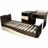 Кровать-трансформер маятник «Чунга-Чанга» современного цвета и дизайна совместила в себе кроватку для новорожденного (120х60см) с пеленальным столиком, кровать размером 170х60см, стол с бортиками и тумбу. Кровать имеет ортопедическое основание, вместительные ящики тумбы, большой выкатной открытый ящик кровати (удобно для уборки), защитные накладки на решетках, опускающуюся планку. Для новорожденного ложе устанавливается в верхнем положении, в дальнейшем при опускании в нижнее положение, собирается столик. Материалы: сосна, береза и безопасный ЛДСП Размер (ДхШ): 185х69 см Производитель: ТМК Островок уюта. Россия Пример трансформирования кроватки см. на фото